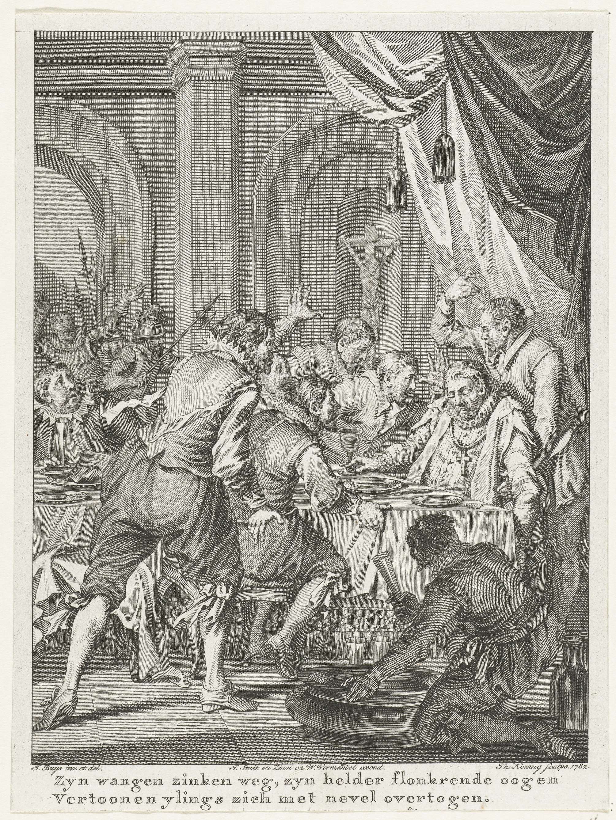 Dood van Requesens. De landvoogd Requesens sterft aan tafel tijdens een banket, 5 maart 1576. Zestiende zang.