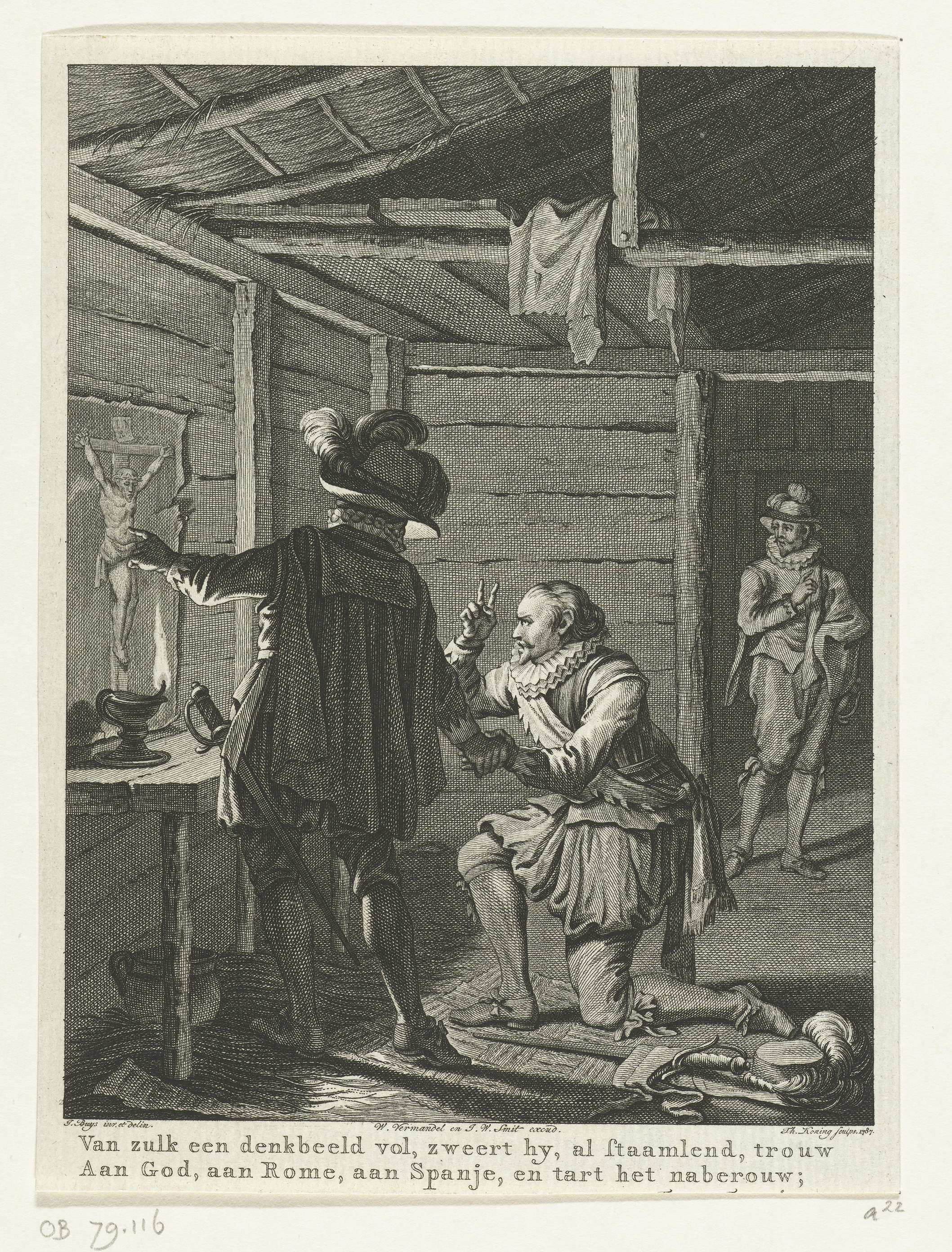 Het verraad van Rennenberg. Rennenberg zweert 's nachts geknield voor een afbeelding van Christus aan het kruis, trouw aan Spanje. Farnese staat naast hem. 1580. Tweeëntwintigste zang.