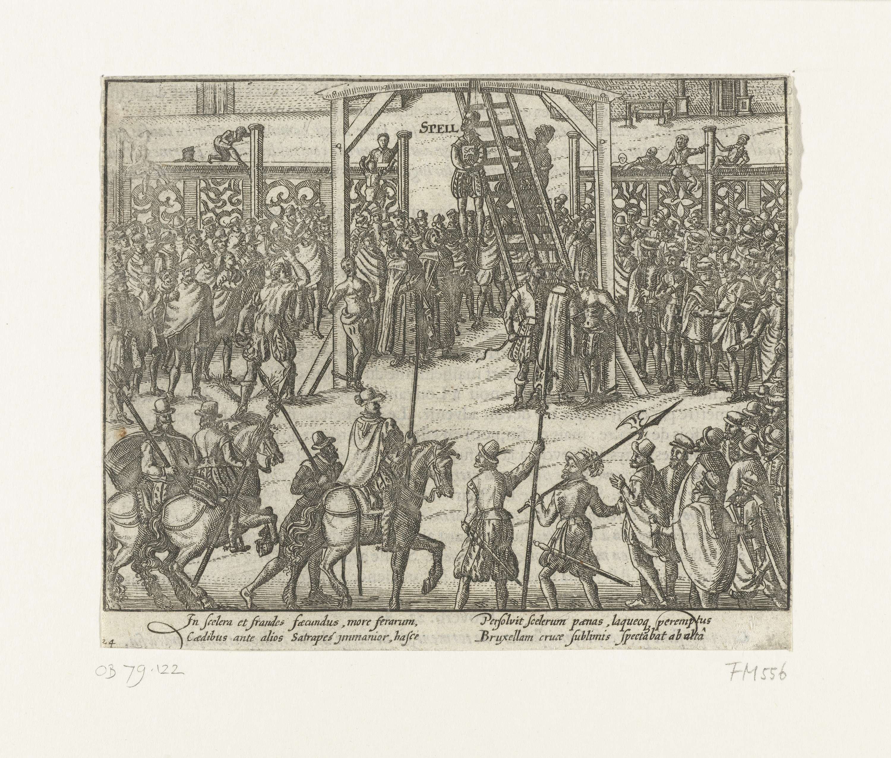 Executie door ophanging op last van Alva van de provoost Hans de Greef, alias Spell of Spelleken te Brussel, 11 februari 1570. Rechts kust Spell een van zijn medewerkers. In het midden hangt Spell aan de galg met zijn vonnis (sentencie) op de borst. Links wordt een andere van zijn medewerkers wordt gegeseld. Met onderschrift ...