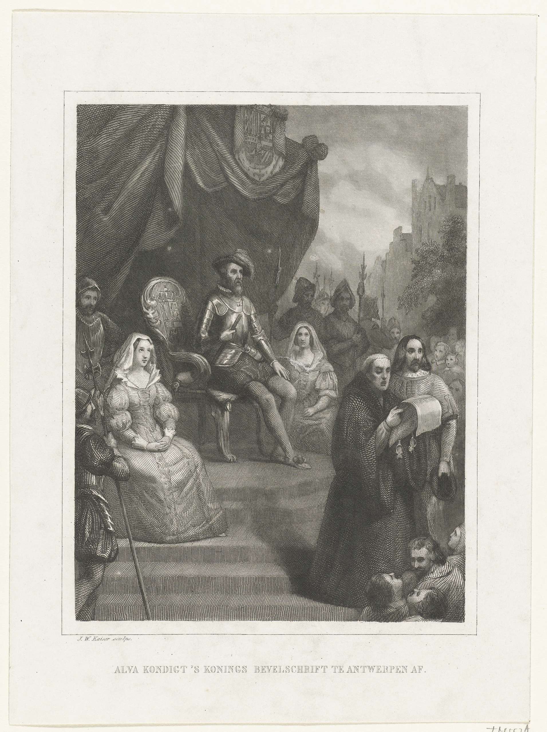 De hertog van Alva laat, zittend op een troon met het wapen van de koning, het Generaal Pardon voorlezen. Antwerpen 1570.
