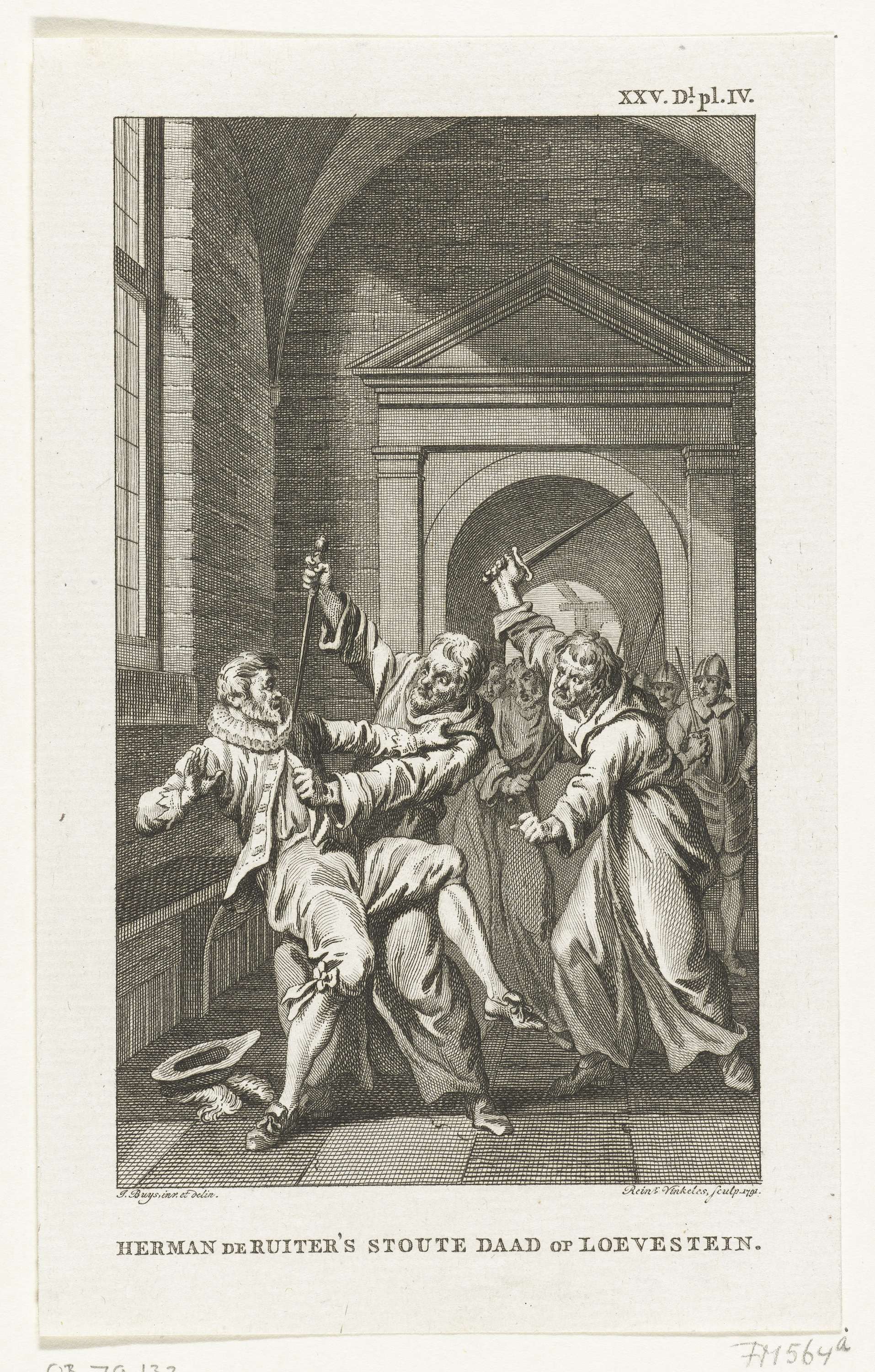 Herman de Ruiter met zijn mannen verkleed als monniken overvallen de slotvoogd en nemen Slot Loevestein in, 9 december 1570. Rechtsboven gemerkt: XXV. Dl. pl. IV.