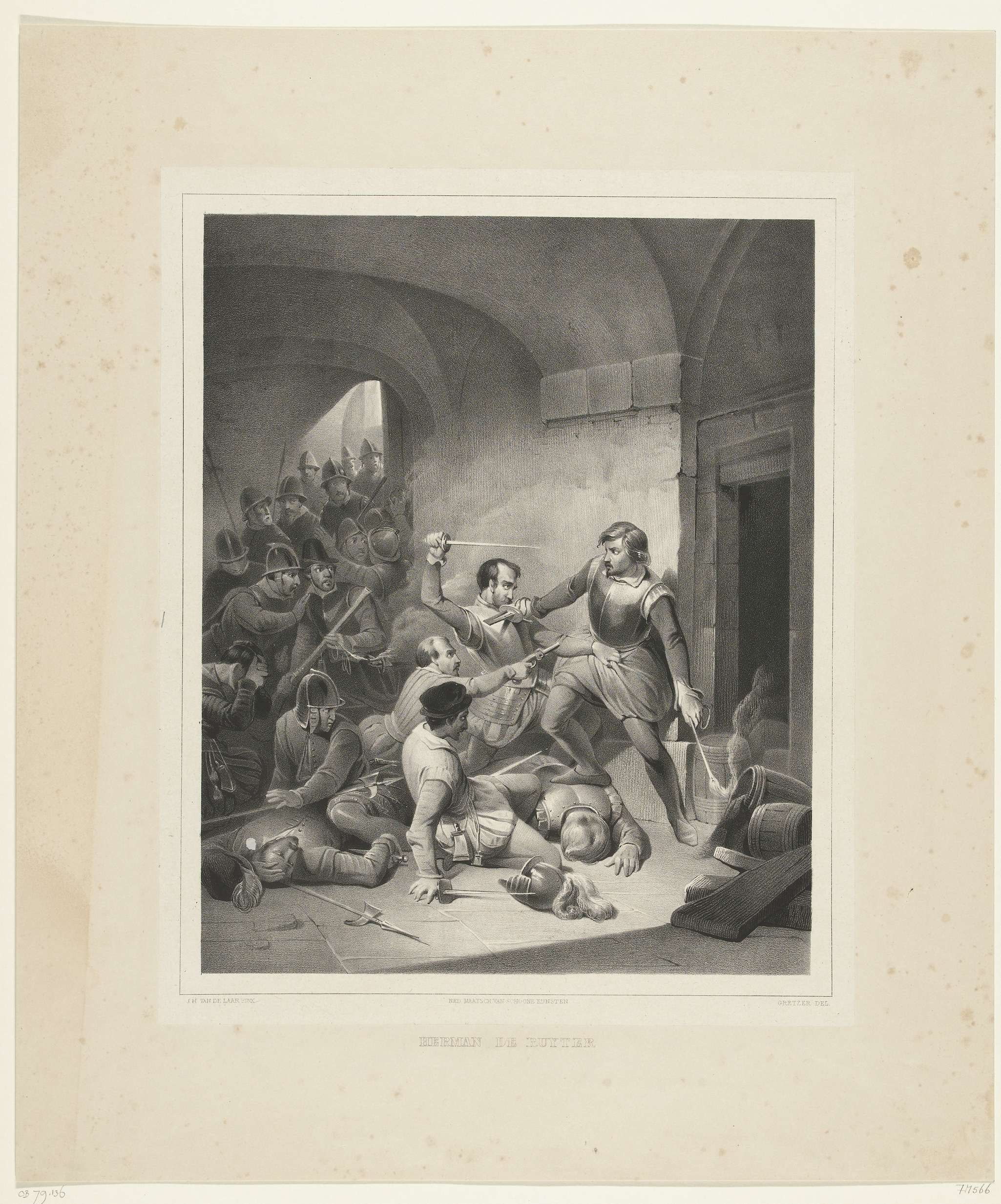 Herman de Ruiter vecht met Spaanse soldaten en steekt de brandende lont in het kruitvat, 19 december 1570.