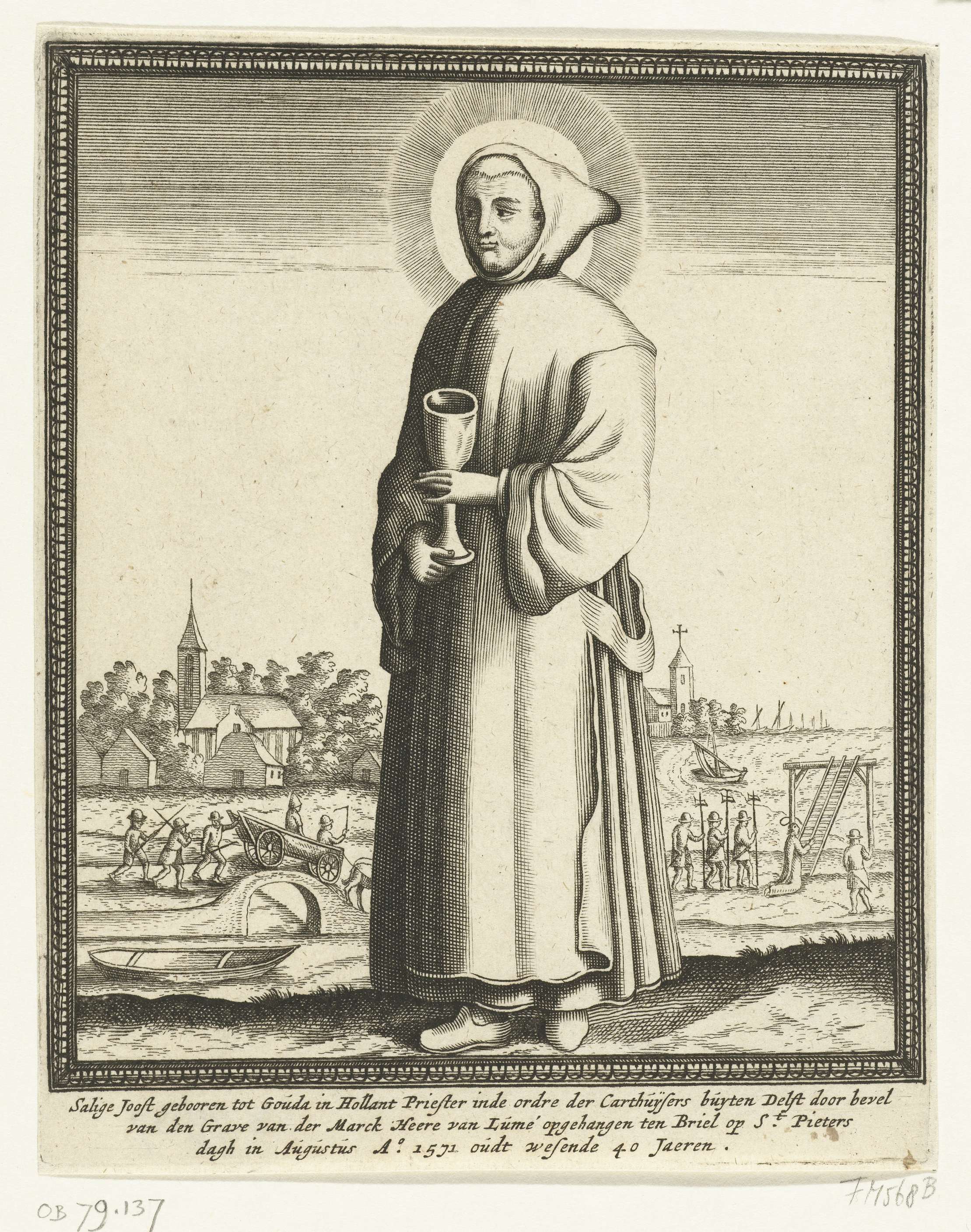 Portret van priester Joost, staande met een miskelk in de handen. Op de achtergrond links zit hij in een kar, rechts knielt hij bij de galg. Volgens het onderschrift is hij opgehangen door de geuzen van Lumey te Den Briel in augustus 1571 (=1572?). Om de voorstelling een lijst, met onderschrift van 3 regels in ...