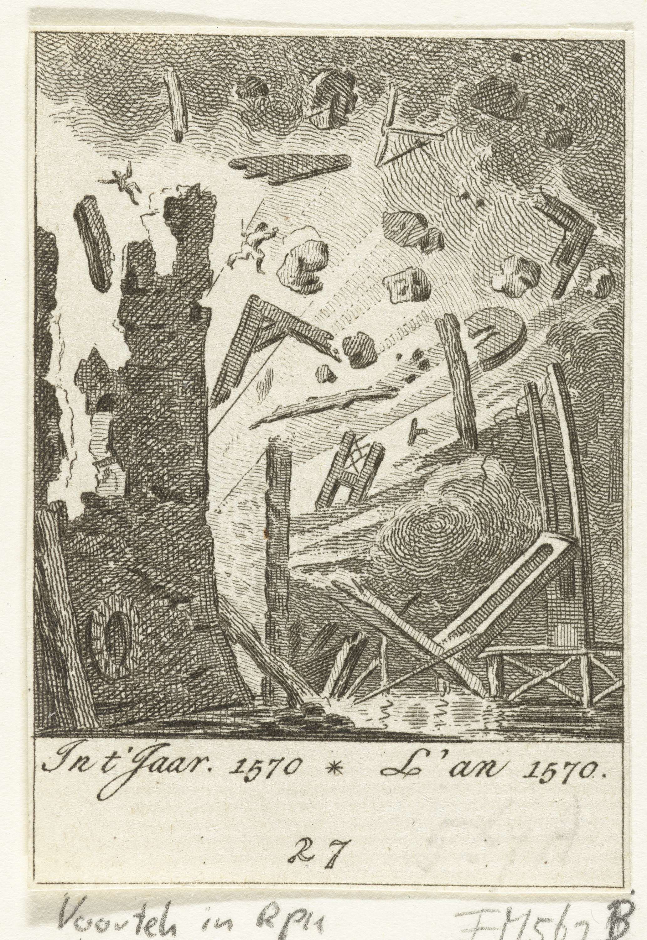 Ontploffing van Slot Loevestein nadat Herman de Ruiter de brandende lont in het kruitvat heeft gestoken, 19 december 1570.