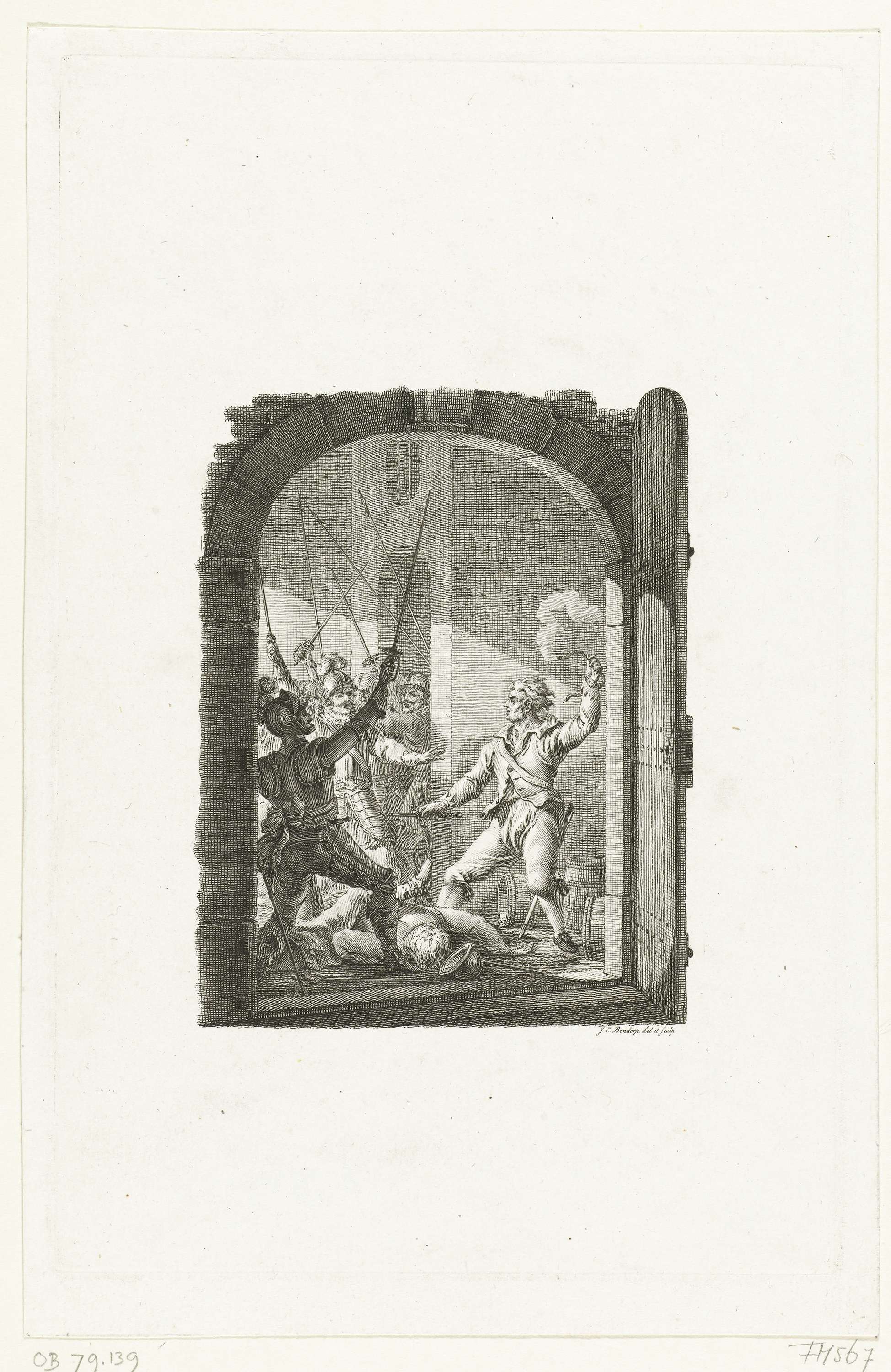 Herman de Ruiter vechtend met Spaanse soldaten en op het punt de brandende lont in het kruitvat te steken en Slot Loevenstein te doen ontploffen, 19 december 1570.