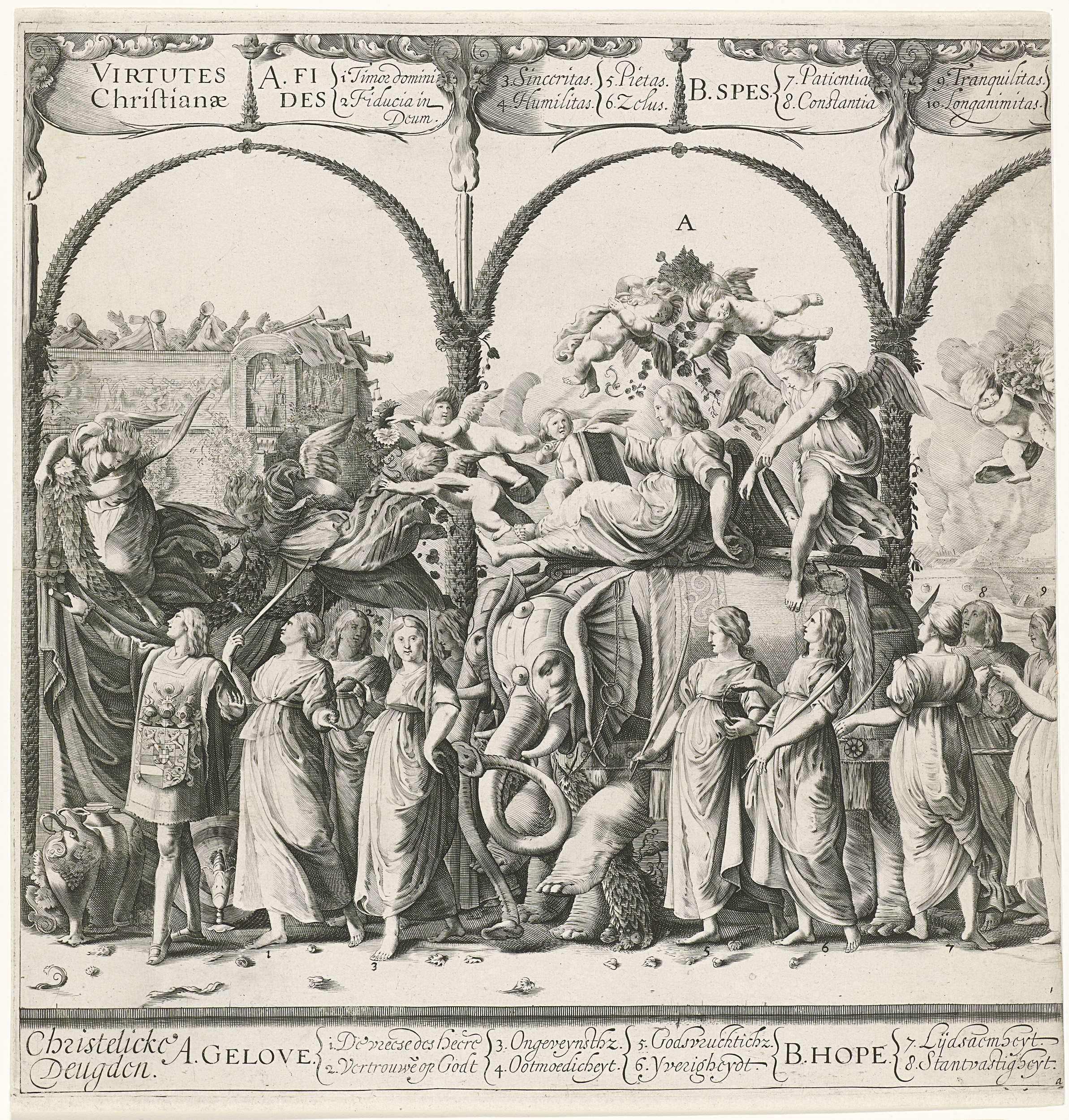Zinnebeeldige voorstelling van de deugden van Prins Willem van Oranje. Zegewagen waarin de prins zit, rijdt onder een erepoort van loofwerk door, getrokken door 3 olifanten. De olifant met de personificatie Geloof; naast haar andere personificaties van deugden. Met uitleg in het Latijn boven de figuren, Hollandse vertaling onderaan.