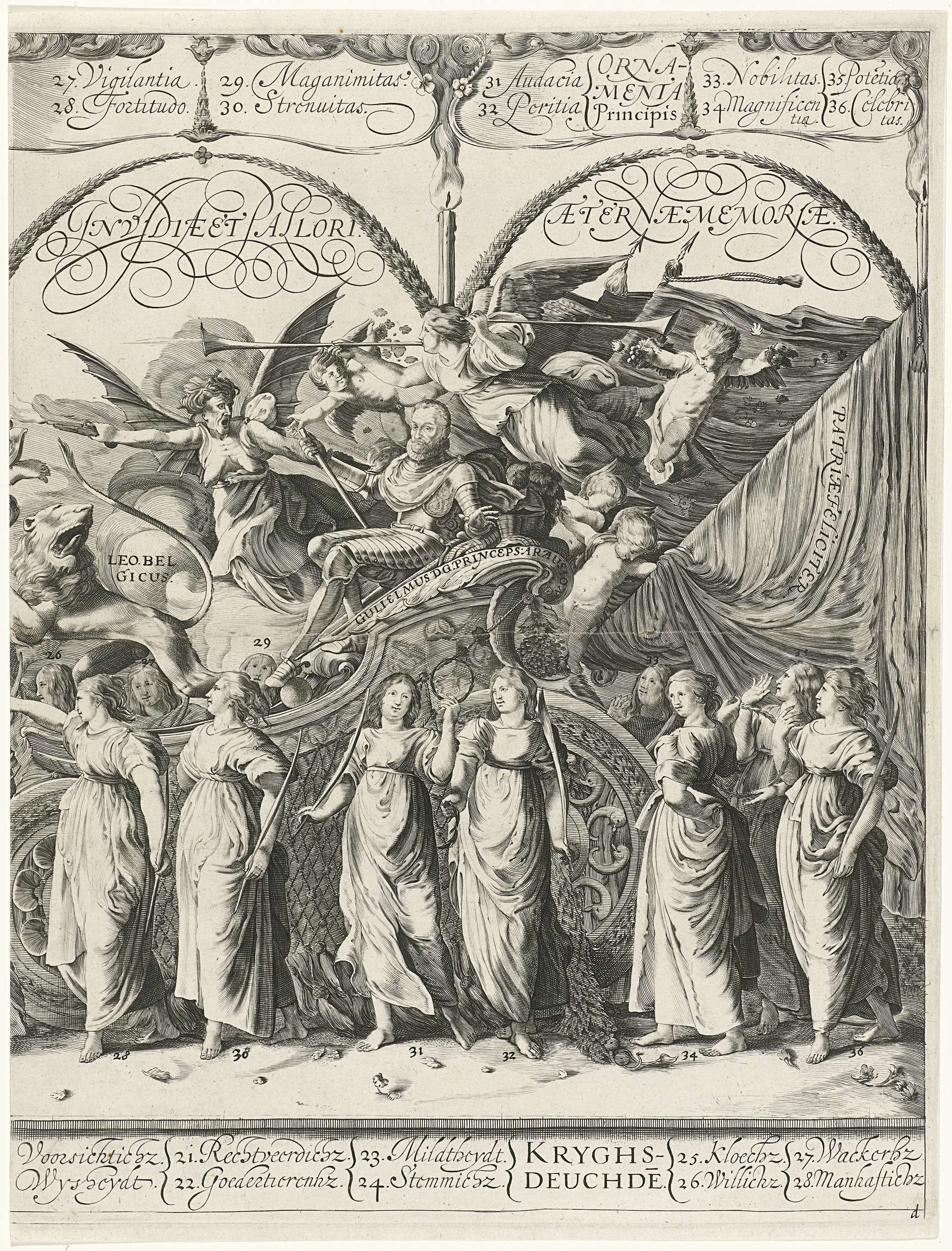 Zinnebeeldige voorstelling van de deugden van Prins Willem van Oranje. Zegewagen waarin de prins en de Hollandse Leeuw zitten. Boven de prins verjaagt de Eeuwige memorie de Afgunst. Naast de wagen andere personificaties van deugden. Achter de wagen rijden vele prinsen van Oranje te paard. Met uitleg in het Latijn boven de figuren, Hollandse vertaling ...