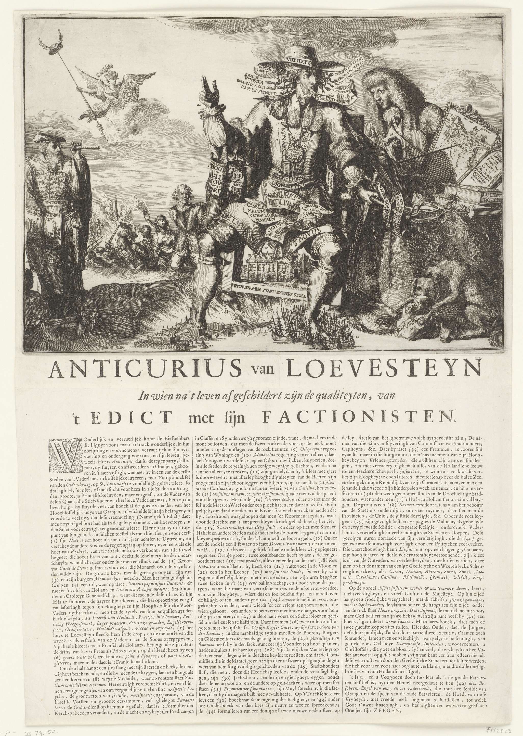 Anticurius van Loevesteyn. Allegorie op de erfstadhouderschap aangeboden aan de prins van Oranje, 1674. De personificatie van de Loevesteinse factie zittend op de stoel van de stadhouder bekleed met patriotische pamfletten van de partij van de gebroeders De Witt. Aan zijn voeten oorlog ter zee en ter land. Achter de stoel staat de Franse koning ...