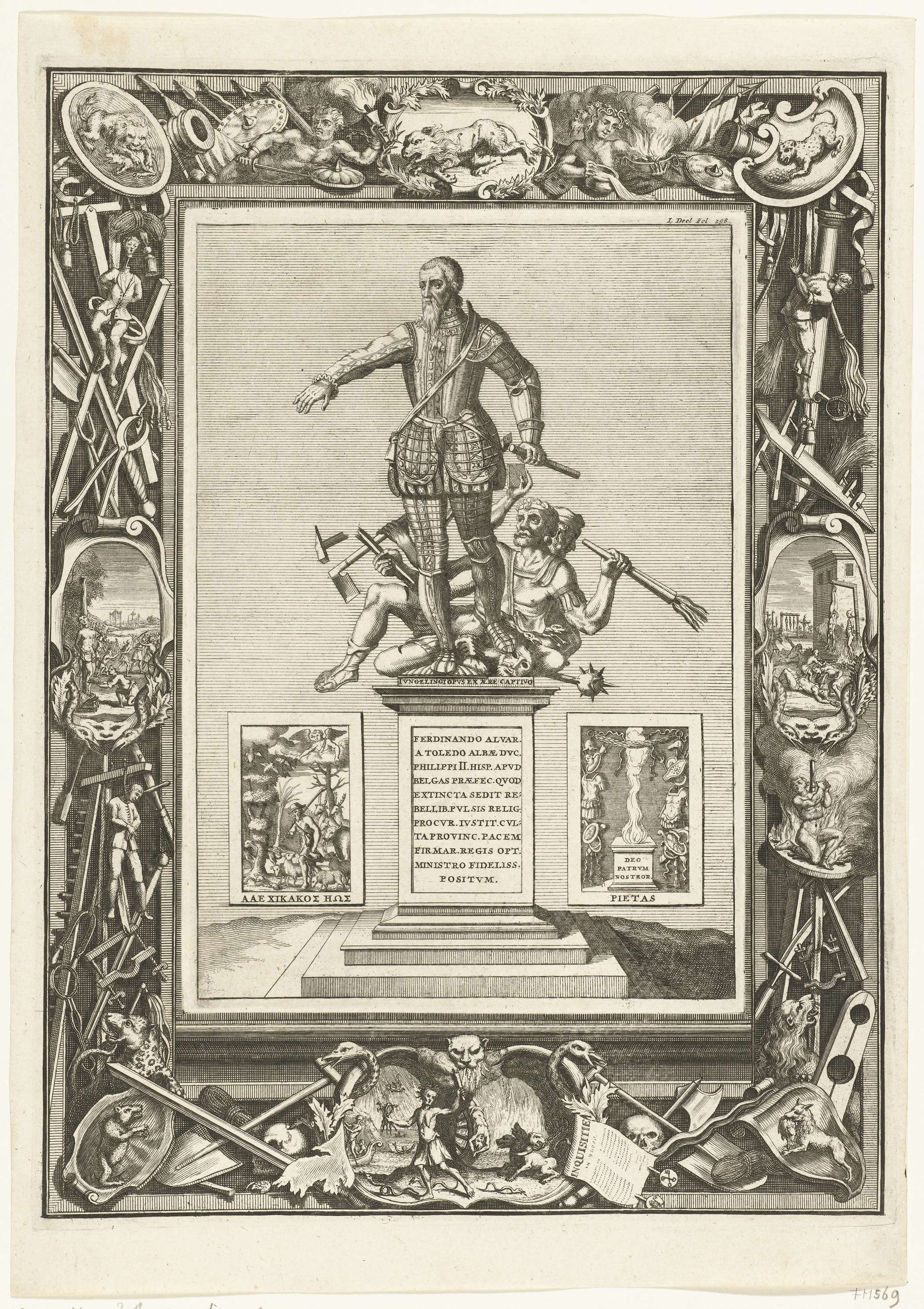 Het standbeeld van de hertog van Alva, door hemzelf opgericht op de binnenplaats van de citadel te Antwerpen, 1571. In omlijsting opgebouwd uit scènes van terechtstellingen, terechtgestelden, martelwerktuigen en allegorische elementen die verwijzen naar de tirannie in de Nederlanden onder Alva.