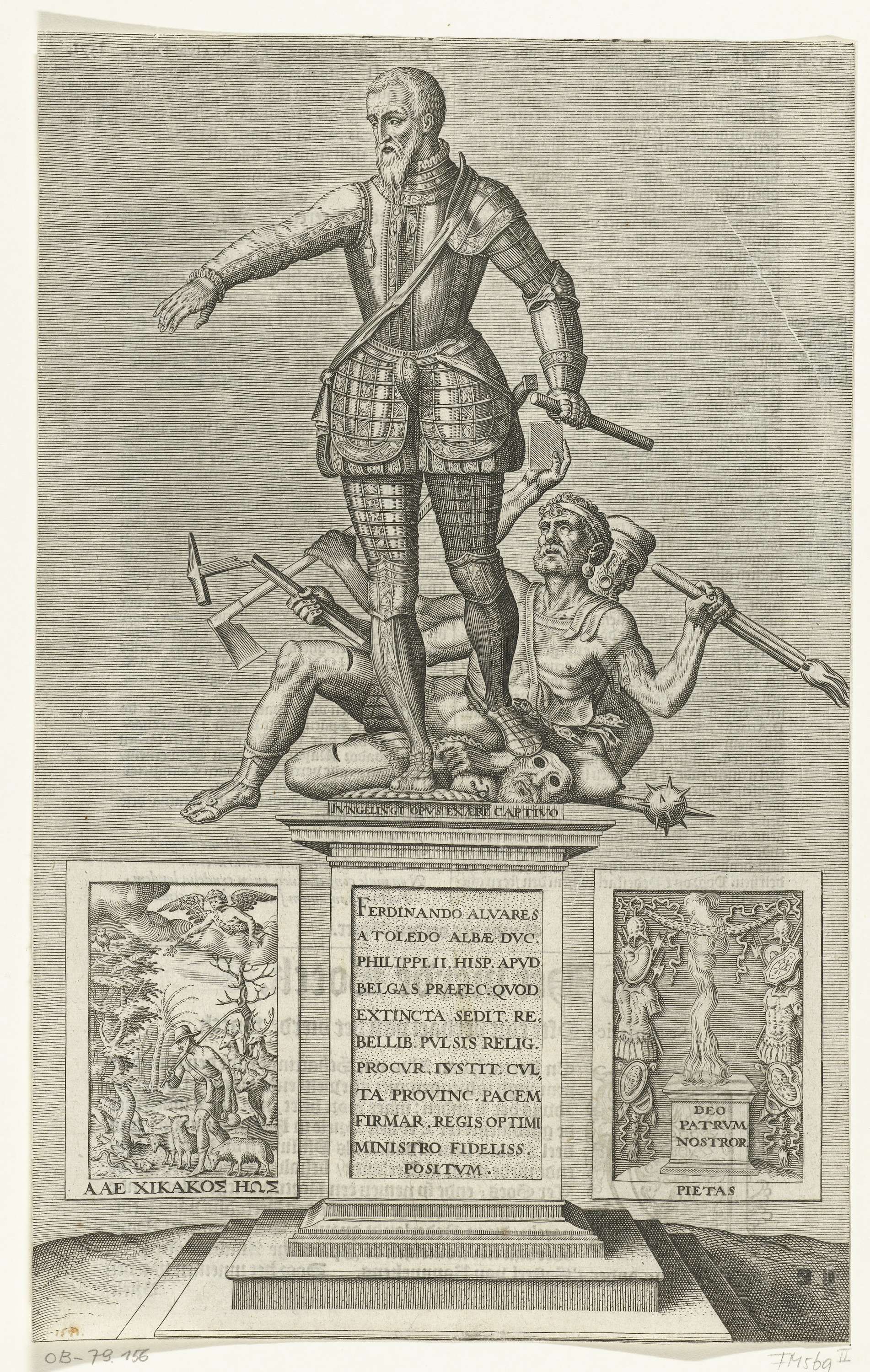 Het standbeeld van de hertog van Alva, door hemzelf opgericht op de binnenplaats van de citadel te Antwerpen, 1571. Met de twee voorstellingen op de zijden van het voetstuk. Op de achterzijde bedrukt met tekst in het Nederlands.