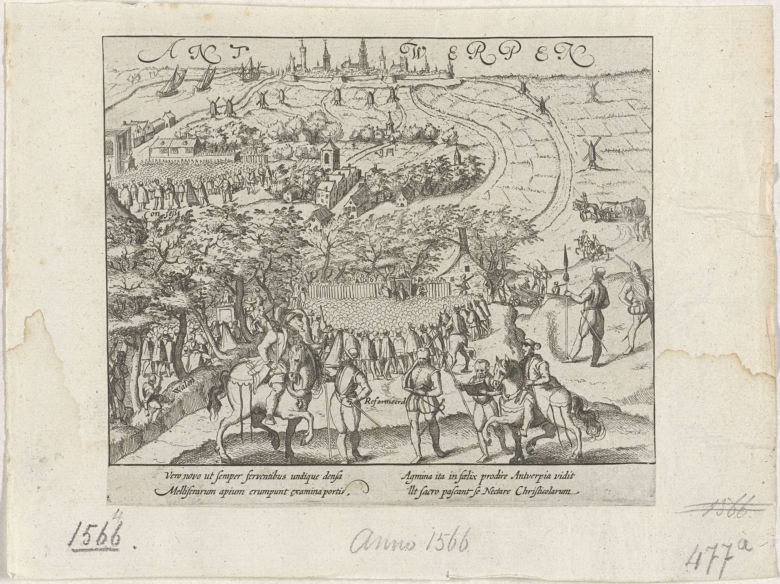 Hagenpreken buiten Antwerpen, 14 juni 1566. Calvinistische bijeenkomsten in de bossen, in de verte de stad Antwerpen. Op de voorgrond gewapende calvinistische ordebewakers. Met onderschrift van 4 regels in het Latijn. Genummerd: 4. Onbedrukt op de achterzijde.