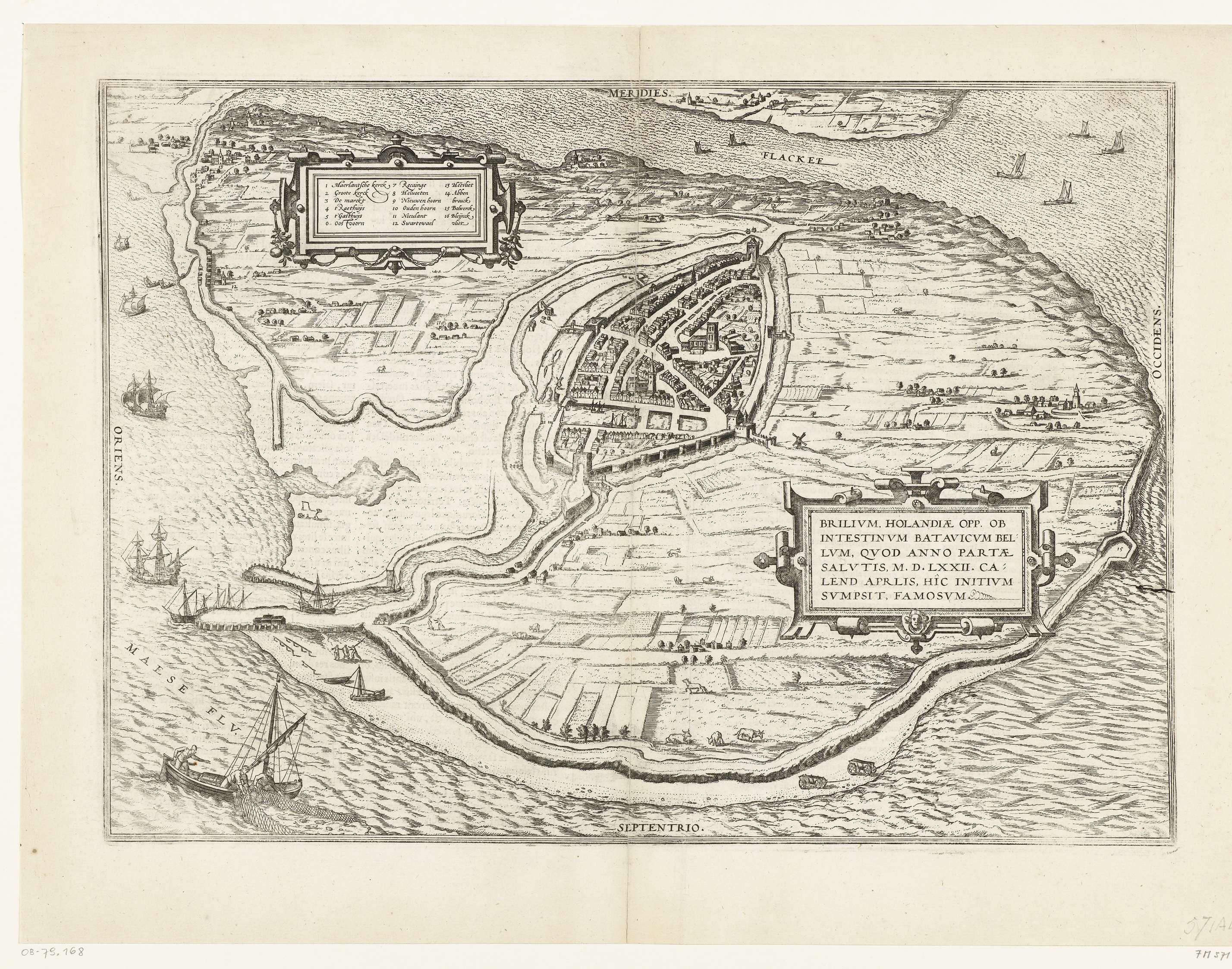 Kaart van het eiland Voorne met een plattegrond van het op 1 april 1572 door de watergeuzen ingenomen Brielle, in vogelvluchtperspectief. Linksboven een cartouche met een Nederlandse legenda 1-16. Rechts een cartouche met de titel in het Latijn. Linksonder een vissersboot. Op verso Latijnse tekst.