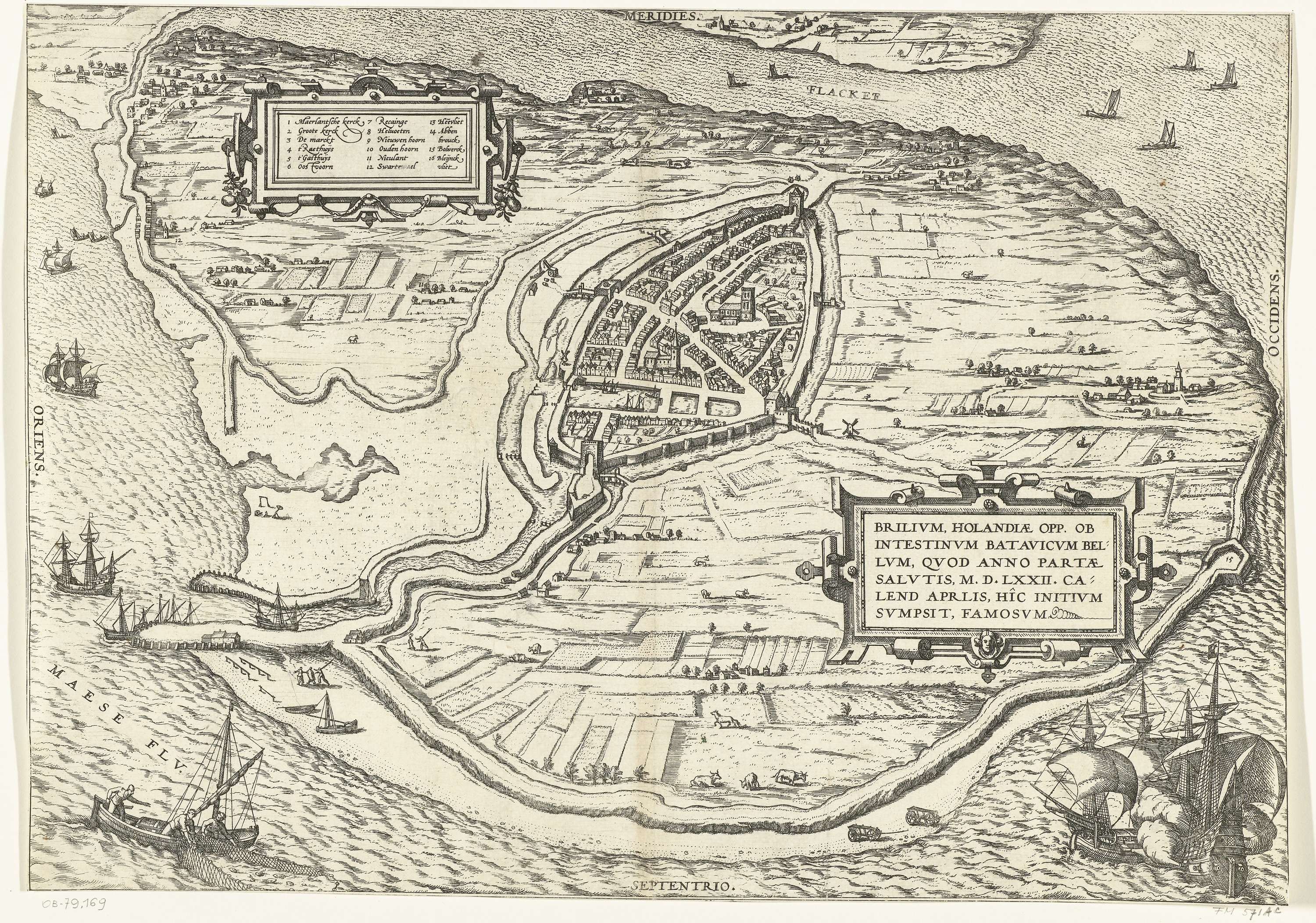 Kaart van het eiland Voorne met een plattegrond van het op 1 april 1572 door de watergeuzen ingenomen Brielle, in vogelvluchtperspectief. Linksboven een cartouche met een Nederlandse legenda 1-16. Rechts een cartouche met de titel in het Latijn. Linksonder een vissersboot, rechtsonder twee oorlogsschepen. Verso onbedrukt.