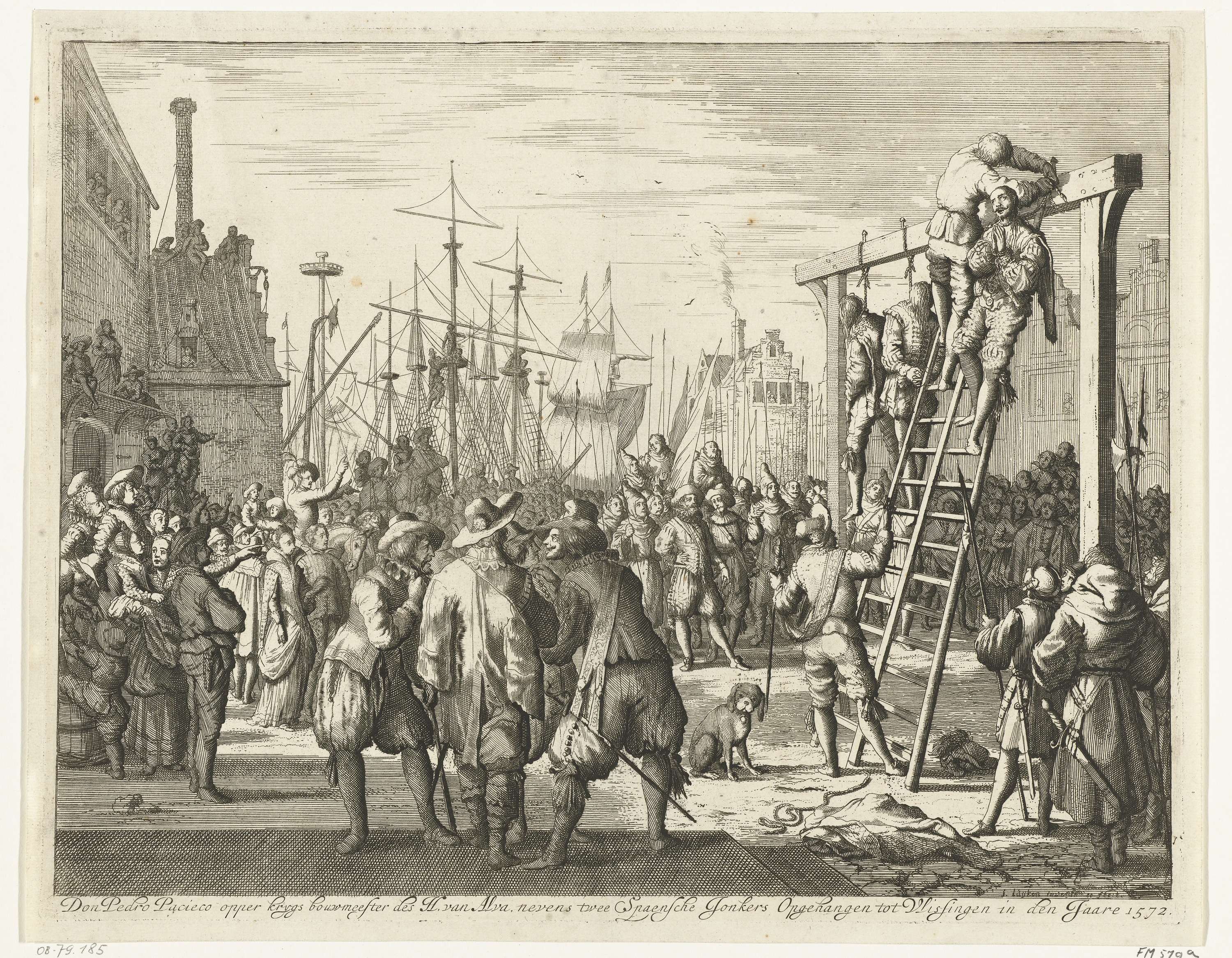 Don Pedro (of Fernando) Pacieco, krijgsbouwmeester (ingenieur) van de hertog van Alva wordt met twee andere Spanjaarden opgehangen te Vlissingen, 8 april 1572. Met vele toeschouwers, op de achtergrond de masten van de schepen aan de kade.