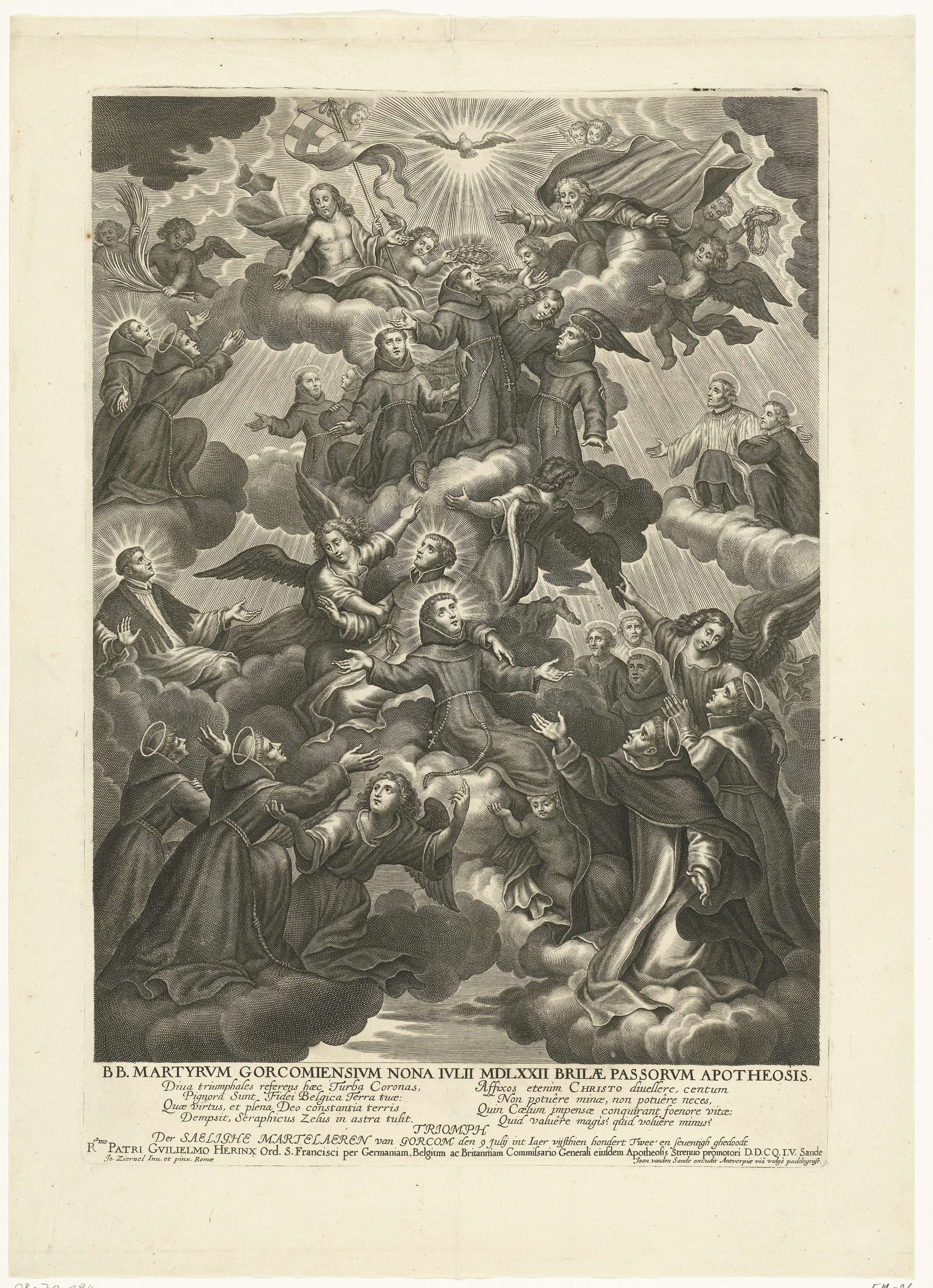 Apotheose van de martelaren van Gorkum, 1572. De monniken en priesters worden door engelen de hemel ingevoerd naar de H. Drie-eenheid van Christus en God en de duif van de Heilige Geest. In het onderschrift de titels en 2 verzen van 4 regels in het Latijn. Vervaardigd ter gelegenheid van de zaligverklaring van de martelaren ...