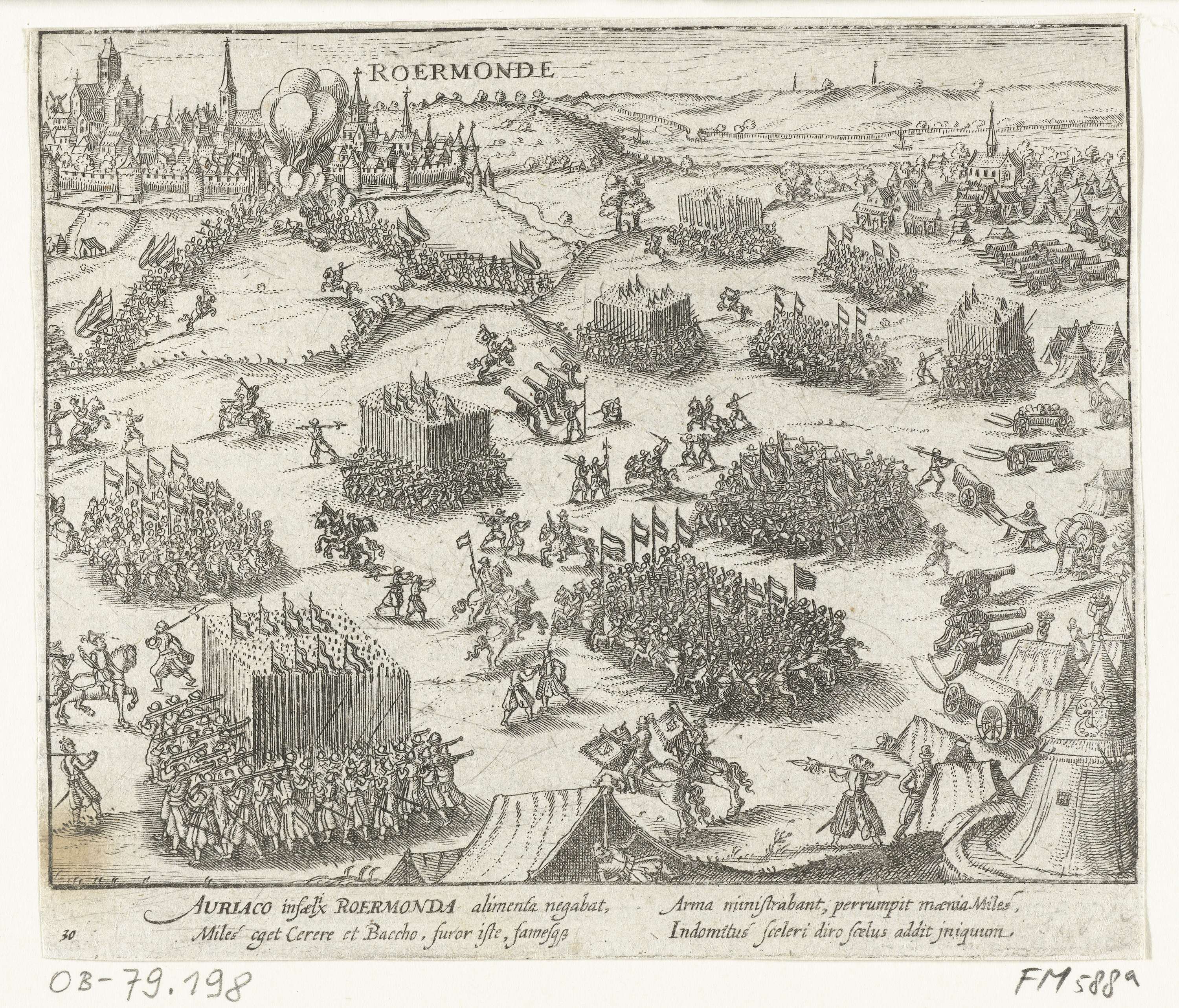Roermond door Willem van Oranje ingenomen, 1572, 4 augustus 1572. Op de voorgrond het kampement van het leger van de prins, boven trekt het leger de stad binnen. Met onderschrift van 4 regels in het Latijn. Genummerd: 30. Bedrukt op achterzijde met tekst in het Latijn.