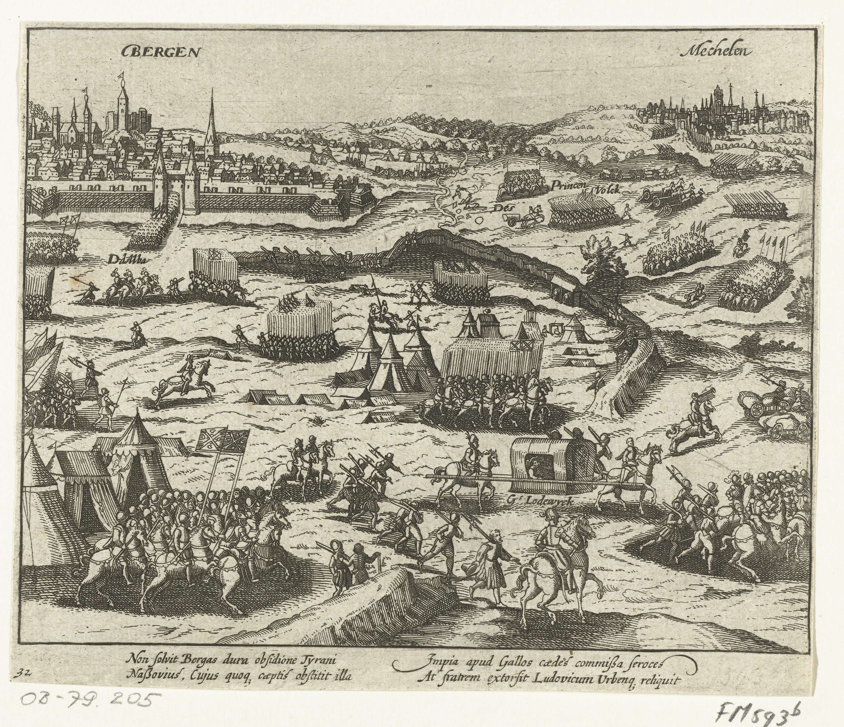 Het leger van Lodewijk van Nassau verlaat Bergen, 6 september 1572. Links in de verte neemt het leger van Alva de stad weer in, rechts de aftocht van het leger van de prins richting Mechelen. Op de voorgrond Lodewijk in een draagstoel. Met onderschrift van 4 regels in het Latijn. Genummerd: 32. Onbedrukt op de ...