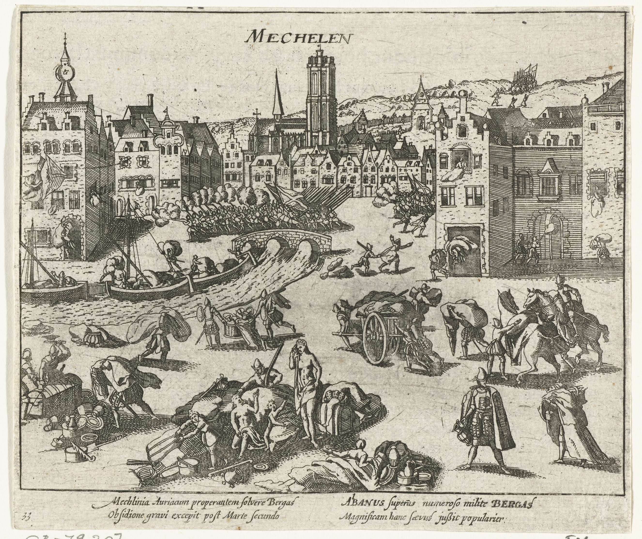 Plundering van Mechelen door het leger van Alva, onder bevel van zijn zoon Don Frederik, 1 oktober 1572. Goederen worden op de markt verzameld en door de soldaten afgevoerd. In het midden op de voorgrond een staande huilende naakte moeder met kinderen. Met onderschrift van 4 regels in het Latijn. Genummerd: 33. Bedrukt op achterzijde ...