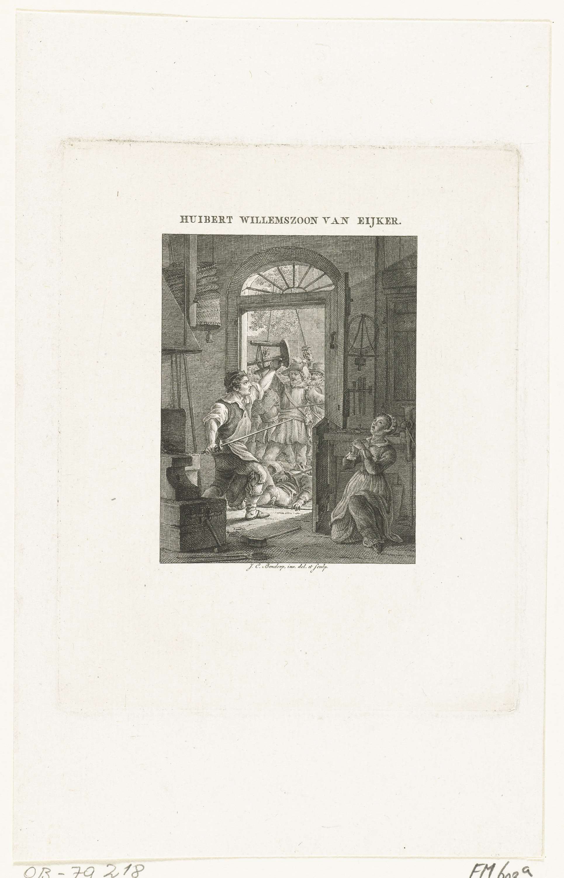 Huibert Willemszoon van de Eijcken, de heldhaftige smid van Naarden, verdedigt met zwaard en driepoot zijn woning tegen de Spanjaarden, 1 december 1572. Rechts zijn knielend biddende dochter.