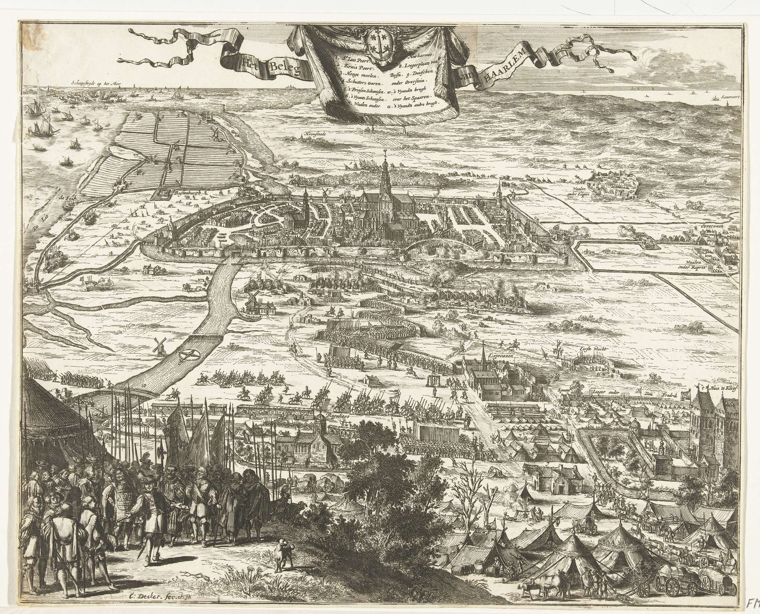 Overzicht van het beleg van de stad Haarlem met het omringende gebied in vogelvluchtperspectief. Op de voorgrond links Spaanse officieren bij een legertent van de Spaanse troepen. Te midden van hen staat Don Frederik met een brief in zijn hand waarin de Haarlemse bevolking wordt gevraagd zich over te geven aan de Spanjaarden. Rechts het ...