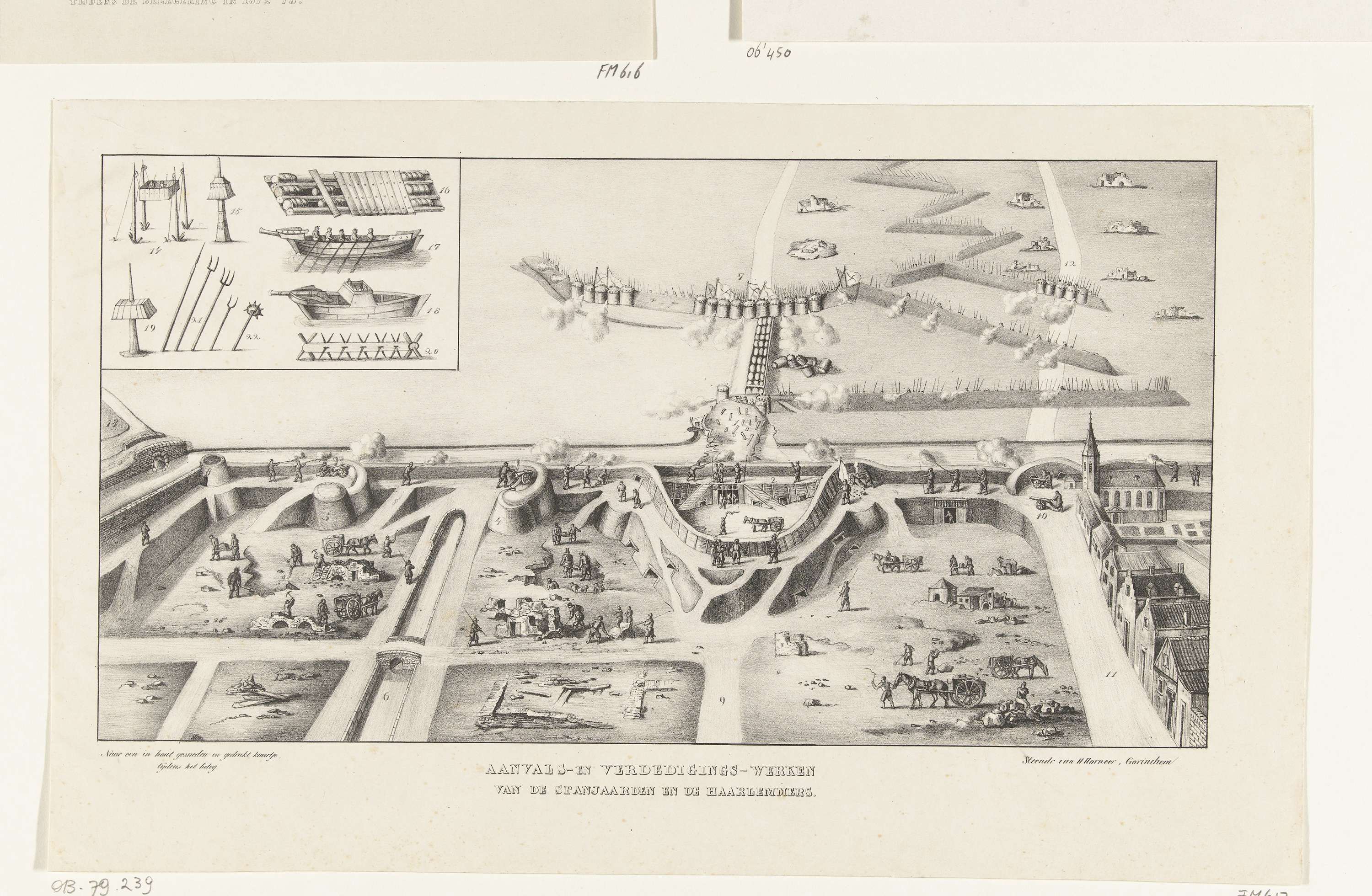 Spaanse schansen en Haarlemse verdedigingswallen tijdens het beleg van Haarlem, 1572-1573. Linksboven een inzet met enkele typen wapens en bewapende boten.