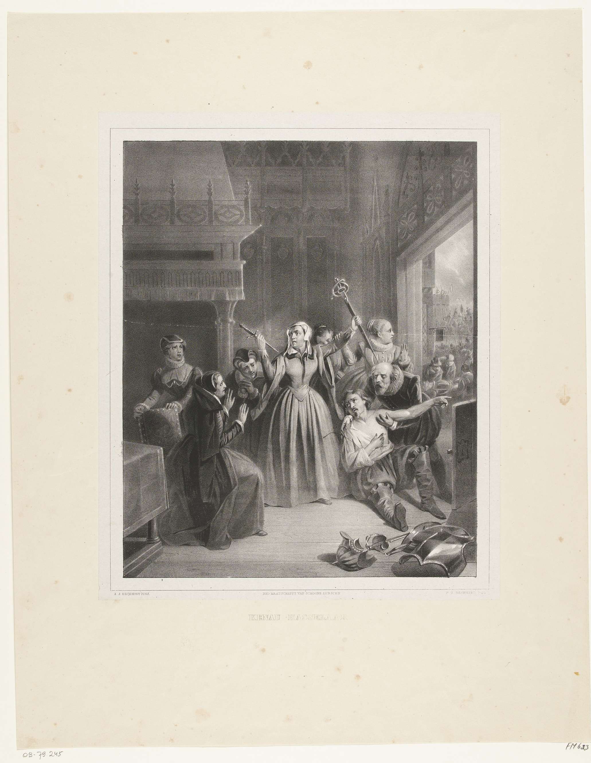 In een interieur met meerdere personen houdt Kenau Simonsdochter Hasselaer strijdvaardig een dolk en een zwaard omhoog, aan haar voeten een gewonde man. Buiten wordt de stad verdedigd tegen de Spanjaarden, 1573.