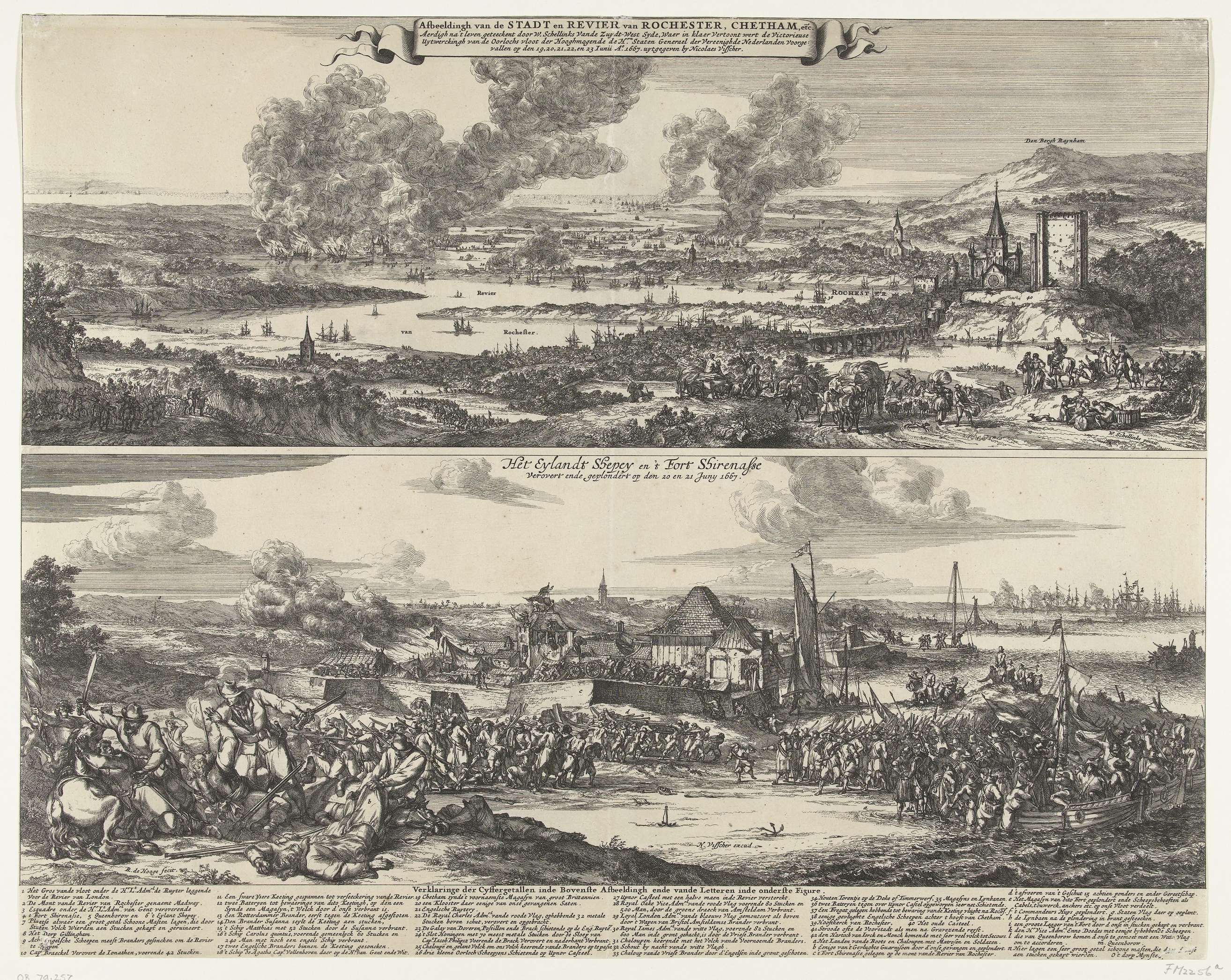 Plaat met twee voorstellingen. Boven een landschappelijke voorstelling van de Tocht naar Chatham en de vernietiging van de Engelse vloot op 20 juni 1667 door de Staatse vloot onder Michiel Adriaenszoon de Ruyter. Onder een voorstelling van de verovering van het eiland Sheppey met het fort en magazijn te Sheerness door de troepen van kolonel ...
