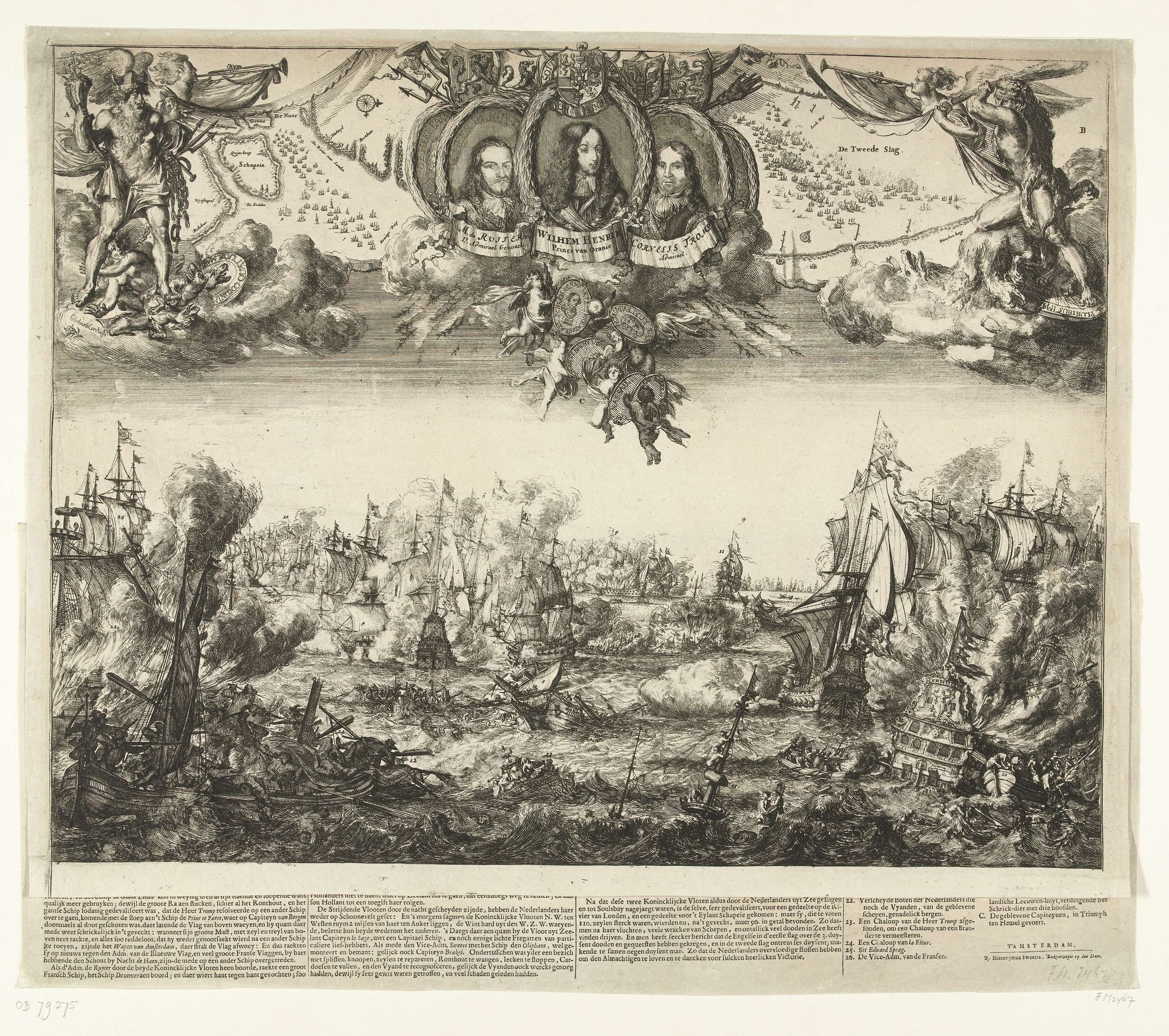 De twee zeeslagen voor de Zeeuwse kust op de vlakte van Schoonevelt op 7 juni en 14 juni 1673. Grote voorstelling van de slagen tussen de vloot van de Republiek onder Michiel Adriaenszoon de Ruyter en de gecombineerde Engels-Franse vloot onder Prins Rupert en graaf Jean d'Estrées. Bovenaan medaillons met portretten van Willem III, Michiel ...