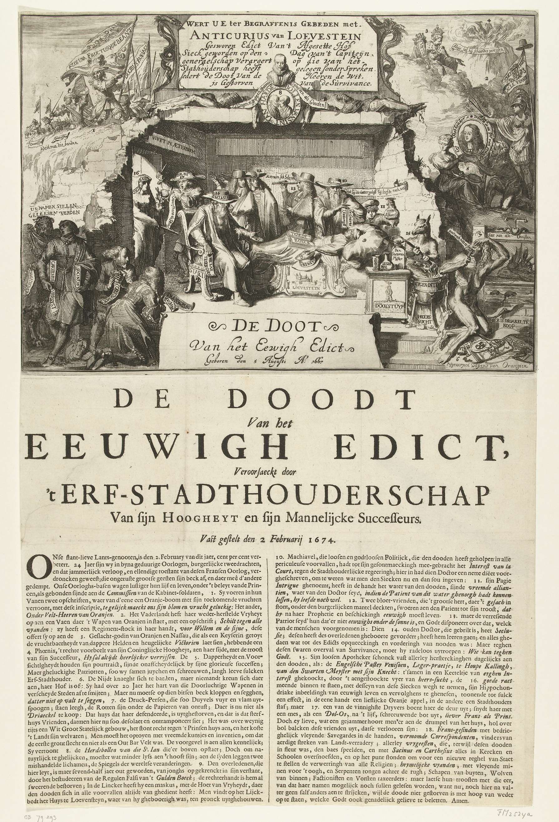 Allegorie op de afschaffing van het Eeuwig Edict uit 1667 met het aanbieden van het erfstadhouderschap aan de prins van Oranje, 2 februari 1674. Vervallen monument waarin Anticurius van Loevestein (de personificatie van de Loevesteinse factie) op zijn doodsbed ligt, omgeven door allegorische figuren, waaronder de Acte van Seclusie. Bovenaan een borstbeeld van Van Oldenbarnevelt ...