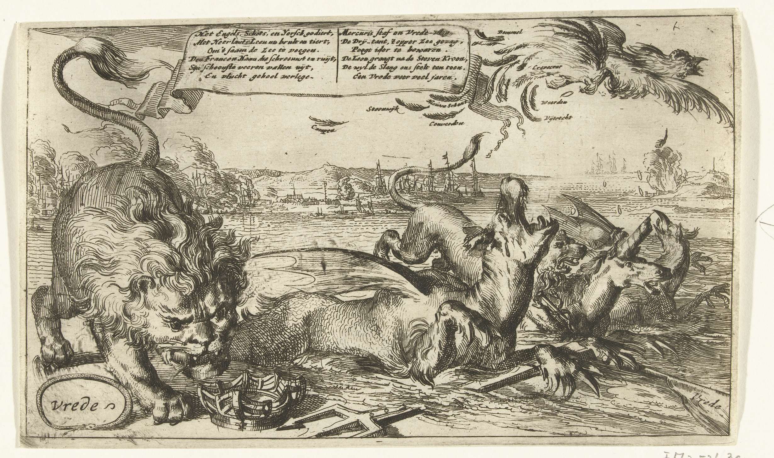Gezamenlijke heerschappij van Nederland en Engeland over de zeeën, 1674. Een griffioen (Ierland), eenhoorn (Schotland), leeuw (Republiek) en draak (Engeland) beheersen gezamelijk de zeeën, in de lucht vlucht een haan, veren en munten achter zich latend. Op de voorgrond een leeuw bij een schepenkroon en een slang om het woord Vrede. Bovenaan een cartouche met ...