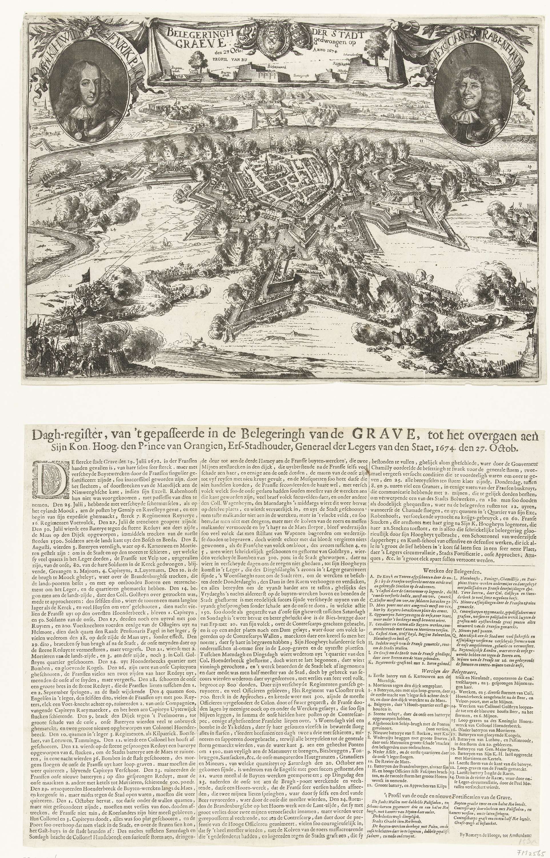 Beleg en verovering van Grave door Willem III, 25 juli tot 29 oktober 1674. De beschietingen van de stad gezien vanuit de positie van de belegeraar. Bovenaan aan weerszijden van de titel medaillons van Willem III en Rabenhaupt. Prent met los tekstblad met in 3 kolommen een chronologische beschrijving van de gebeurtenissen van dag tot ...