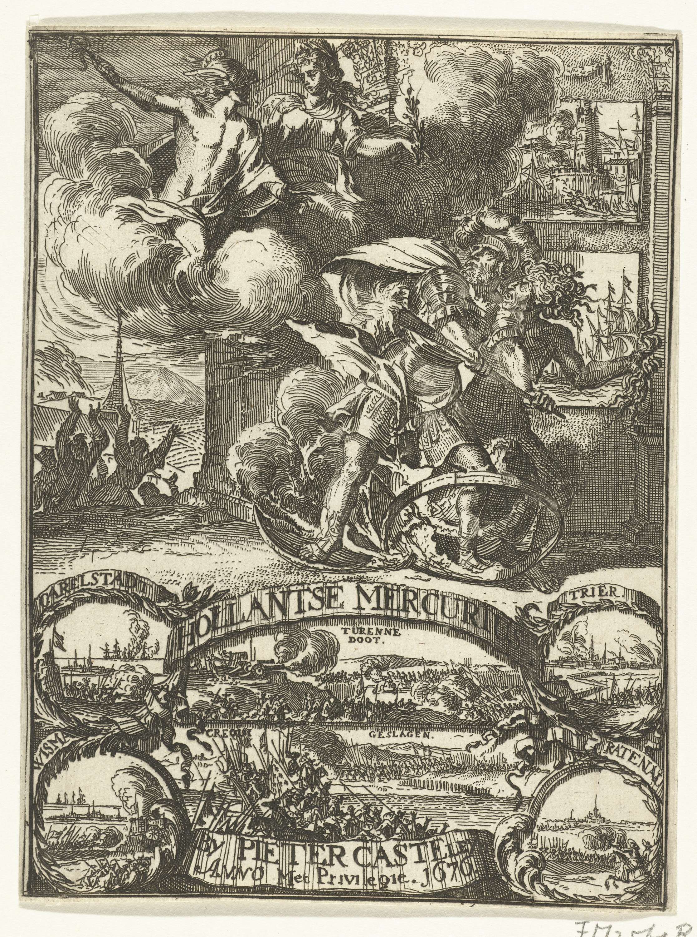 Ttitelpagina voor de Hollandsche Mercurius over het jaar 1675. Mercurius en Vrede in de wolken boven Oorlog en Medusa. Hieronder 6 kleine scènes van zeeslagen en gevechten, met plaatsnamen.