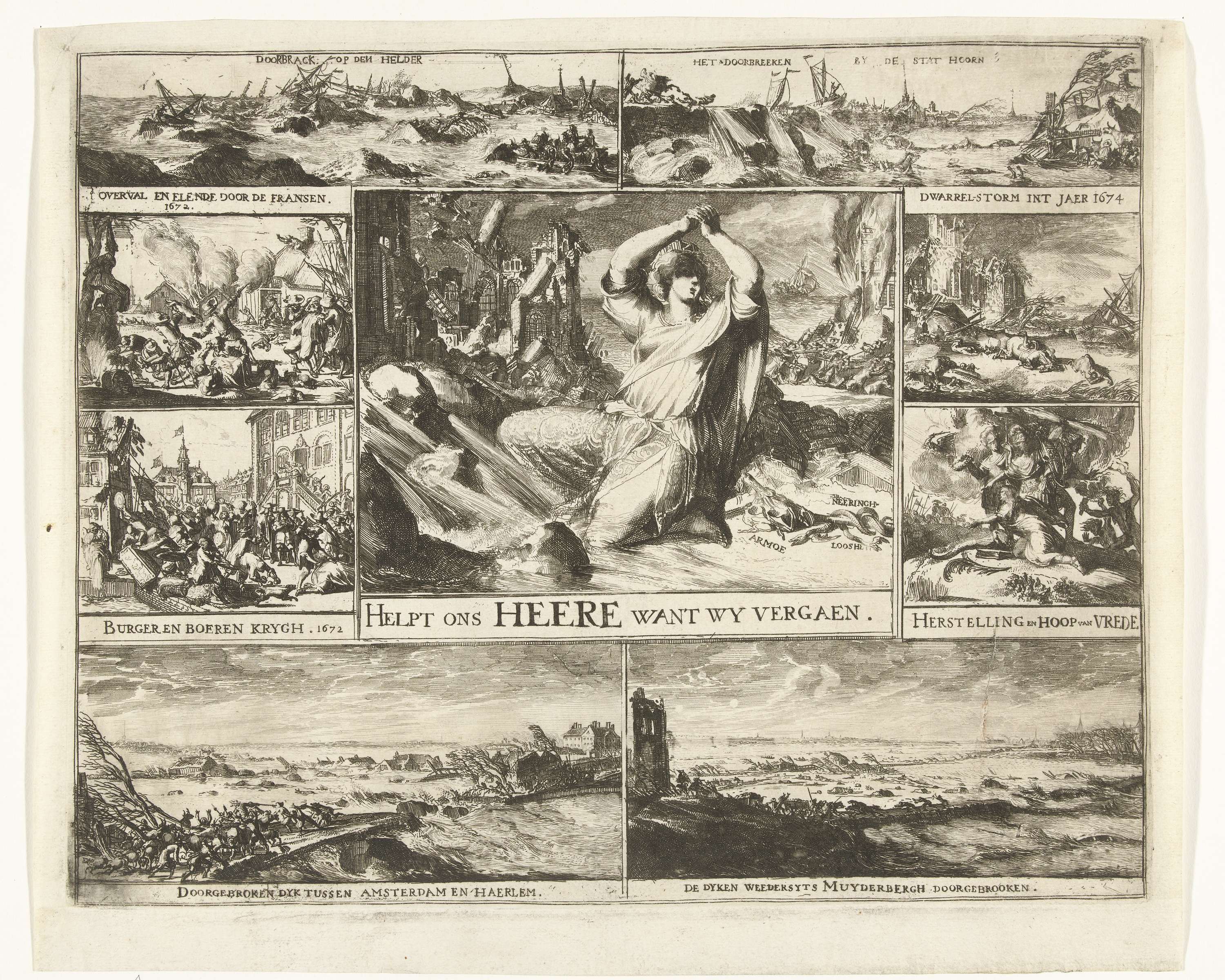 Klacht over de rampspoed in de Republiek tussen 1672 en 1675. Centrale voorstelling van een tussen ruïnes en overstromend water knielende Nederlandse Maagd die met gevouwen handen tot God bidt om hulp. Hieromheen 8 andere kleinere scènes van de Allerheiligen Vloed van 4 november 1675 en andere rampen die het land in de afgelopen jaren ...