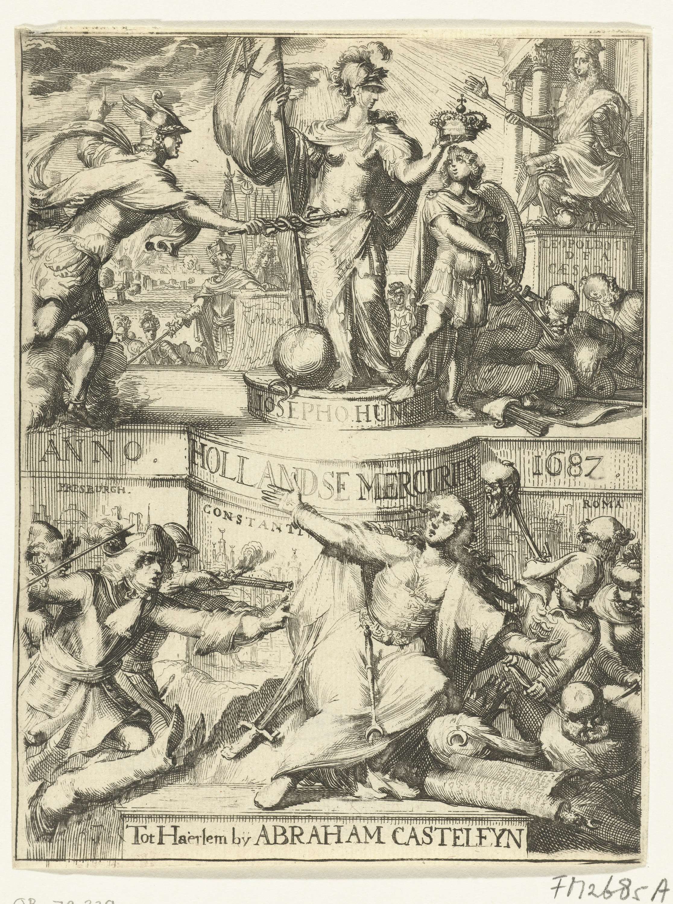 Titelpagina voor de Hollandsche Mercurius over het jaar 1687. Onder gevechten rond een vrouwelijke personificatie tussen Oostenrijk en de Turken in Hongarije. Boven wordt Jozef I gekroond tot keizer, links Mercurius, rechts geknechte Turken.