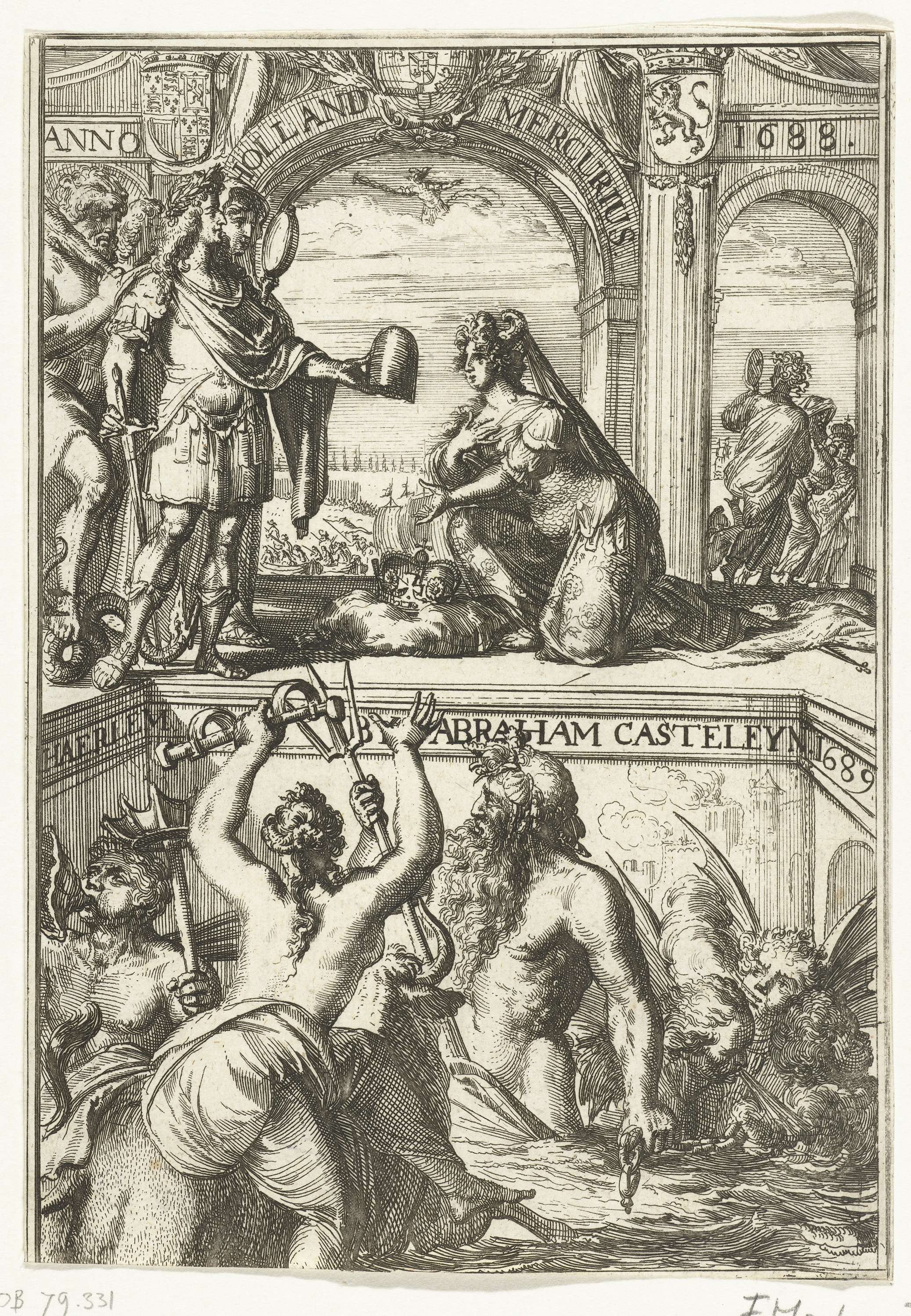 Titelpagina voor de Hollandsche Mercurius over het jaar 1688. Onderaan zeegoden, windkopjes en storm op zee, boven knielt een vrouwelijke personificatie (Engeland?) voor Willem III. Waarschijnlijk een verbeelding van de tocht van Willem III naar Engeland in november 1688.