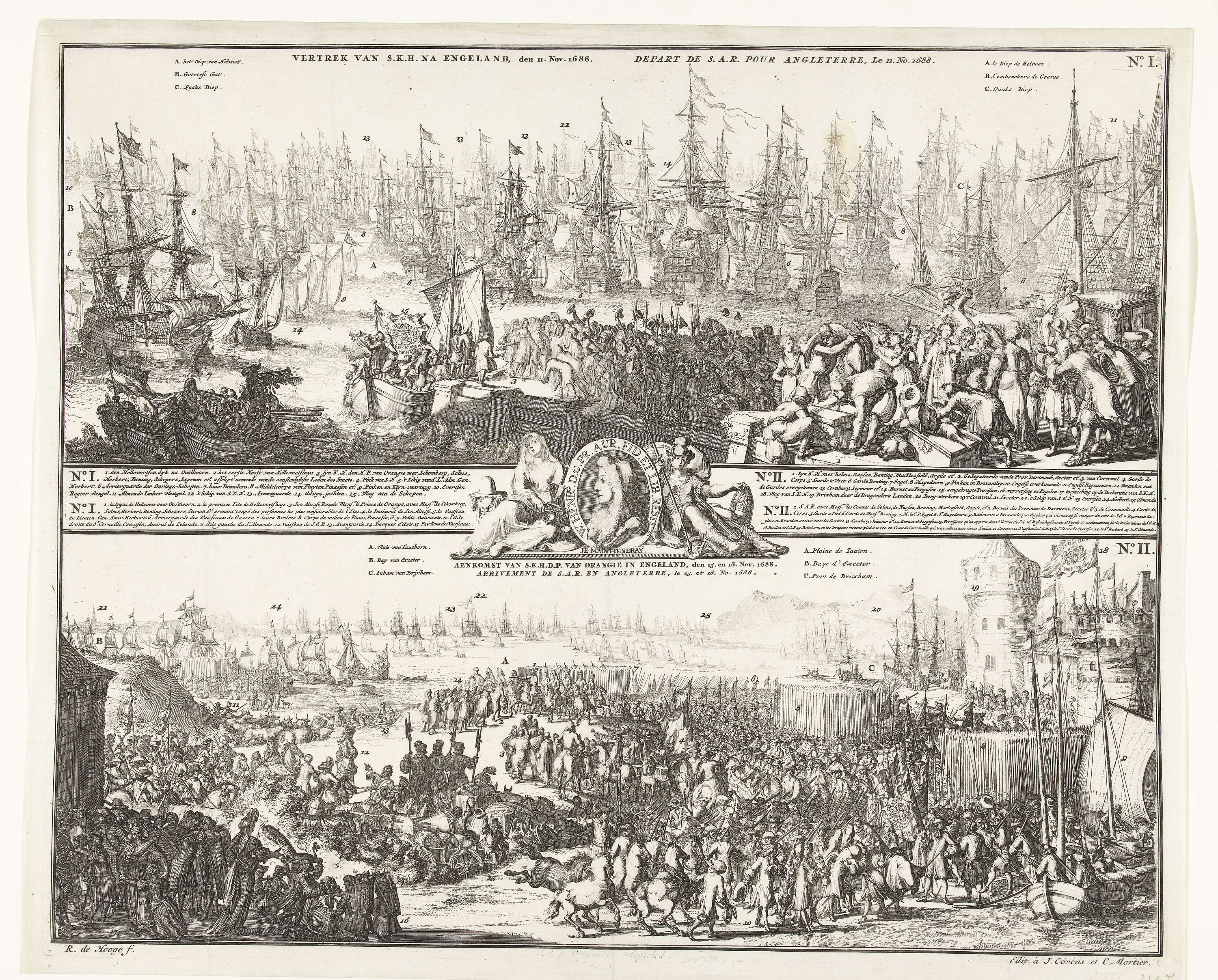 Tocht van Willem III naar Engeland, 1688. Twee voorstellingen, genummerd I en II. Boven: het vertek van Willem met zijn vloot op 11 november 1688 vanuit Hellevoetsluis. Volle kade en overzicht van de schepen. Onder de voorstelling een verklaring van de cijfers 1-15 in het Nederlands en Frans. Onder de aankomst van de vloot van ...