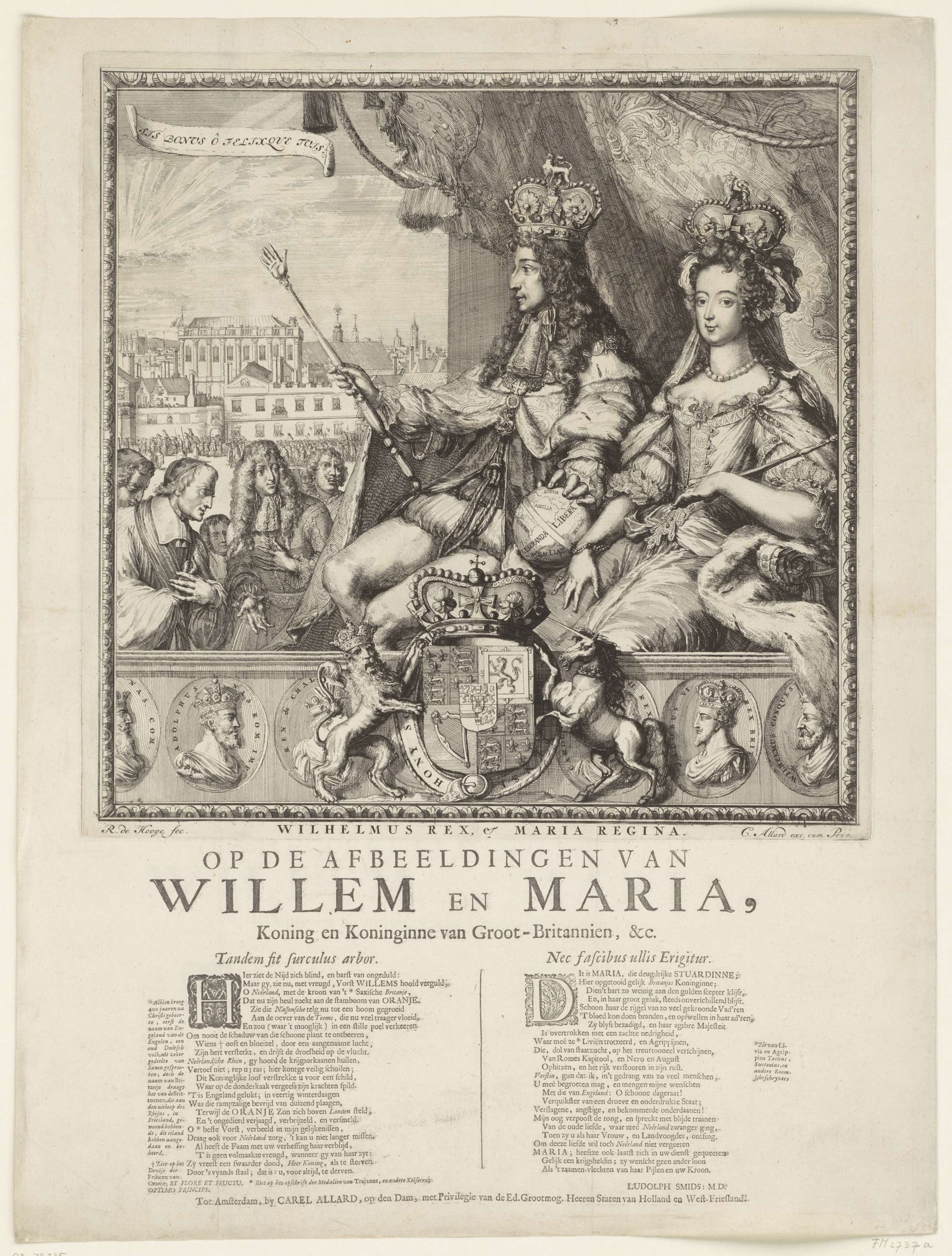 Allegorie op de kroning van Willem en Maria als koning en koningin van Groot-Brittannië, 21 april 1689. Het echtpaar zittend voor een gedrapeerd gordijn, scepters in de hand. Links enkele toeschouwers, op de achtergrond het paleis van Whitehall te Londen. Onderaan het wapen van Groot-Brittannië en medaillons met portretten van eerdere Engelse koningen. Onder de ...