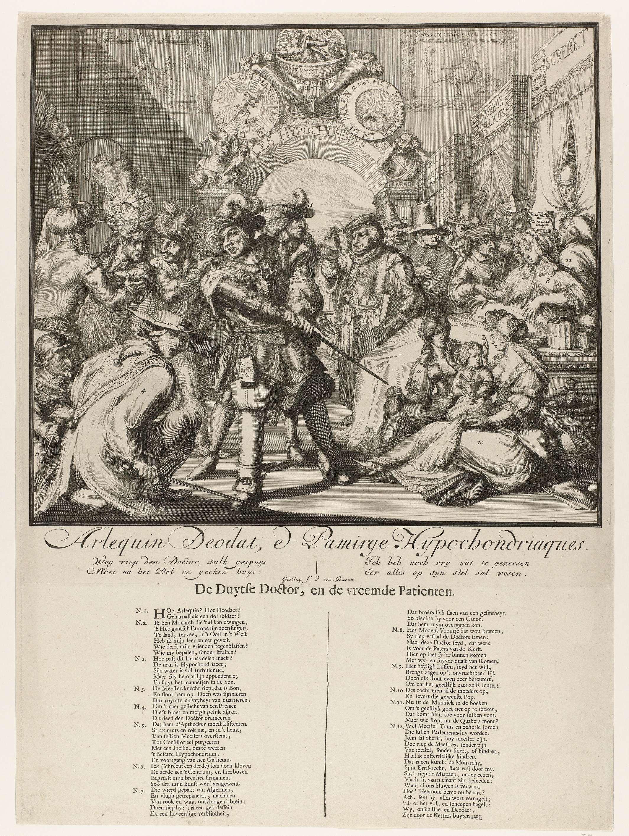 Spotprent op de inmenging van Lodewijk XIV in de Engelse troonopvolging, 1689. Kraamkamer waarin koningin Maria van Modena in bed ligt en bezocht wordt door een Duitse dokter die haar urine bekijkt. In het midden een boze Lodewijk XIV (Harlekijn) die door Willem III wordt tegengehouden, links drie Algerijnen of Turken. Op de voorgrond links ...