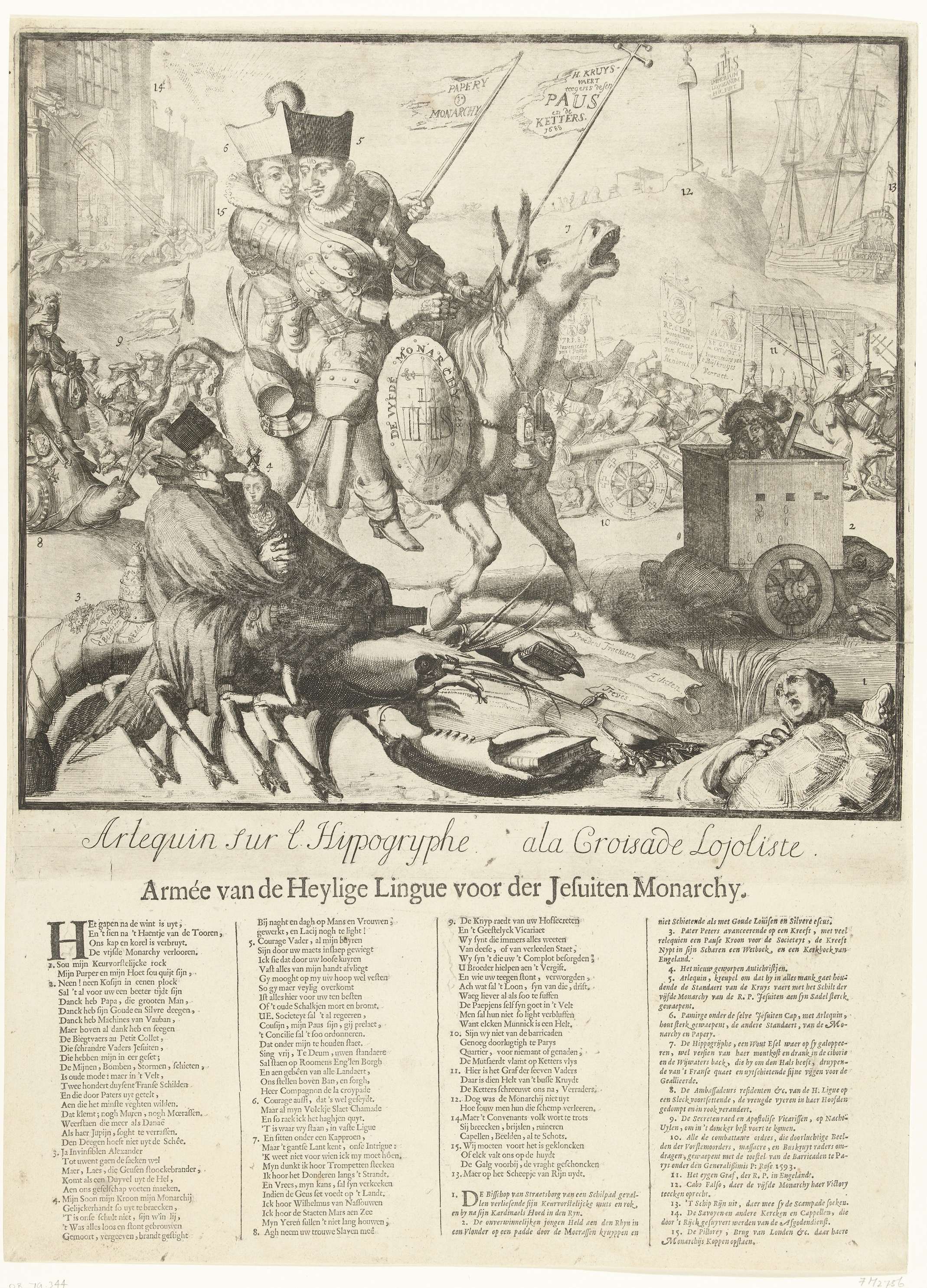 Spotprent op de gezamenlijke strijd van de Heilige Liga van Lodewijk XIV en Jacobus II, 1689. Lodewijk XIV (Harlekijn) en Jacobus II (Pamirge) gezeten onder één hoed op een ezel trekken ten strijde tegen de protestanten. Op de voorgrond pater Peters (Edward Petre) met het ondergeschoven kind op een kreeft, rechts de dauphin in een ...