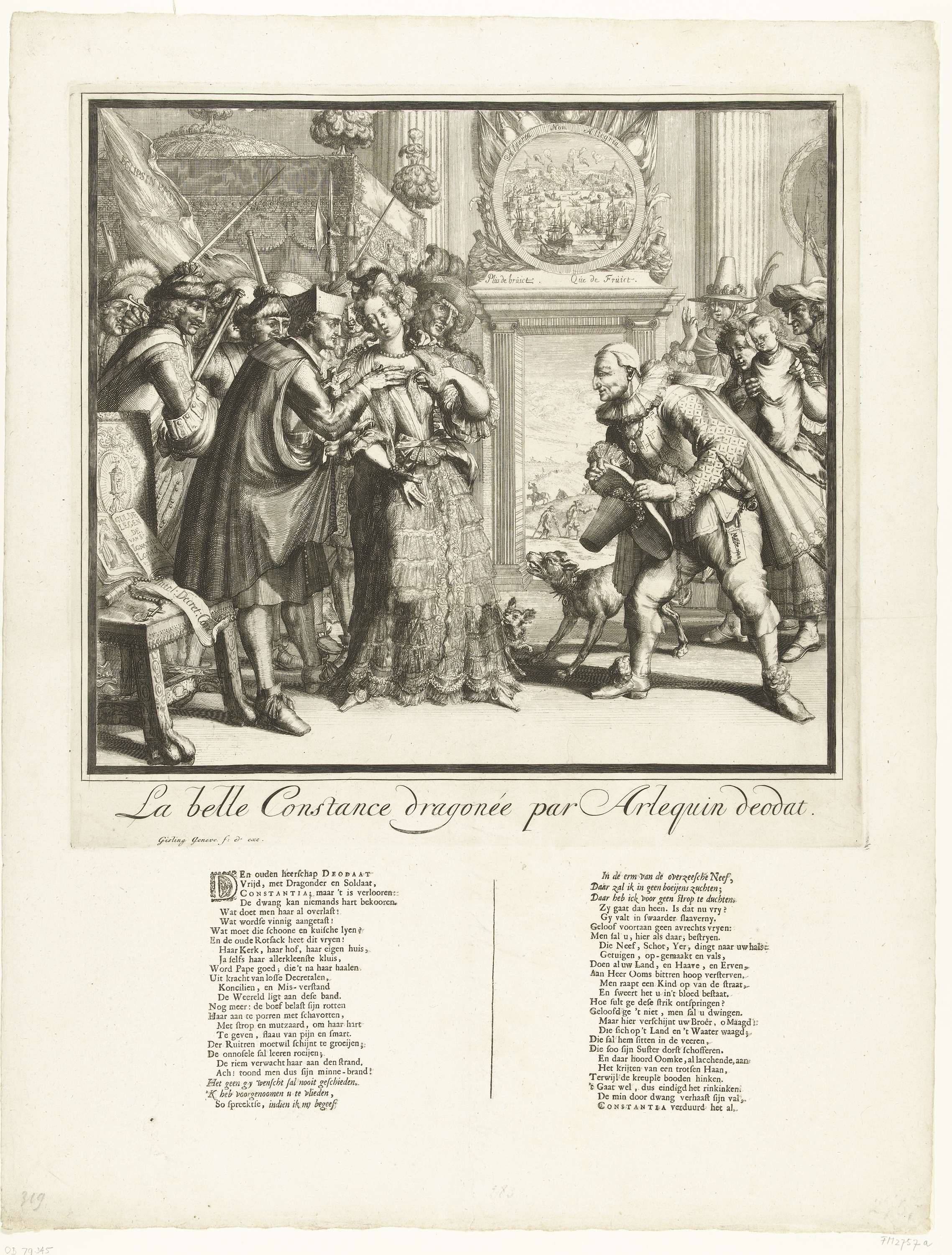 Spotprent op Lodewijk XIV en de vervolging van de protestanten in Frankrijk, 1689. La belle Constance (de Franse protestanten) worden het hof gemaakt door Lodewijk XIV, jezuïeten en soldaten. Bij de groep rechts met koning Jacobus II en de koningin met het ondergeschoven kind kan zij ook geen veiligheid kunnen vinden. Onder de voorstelling een ...