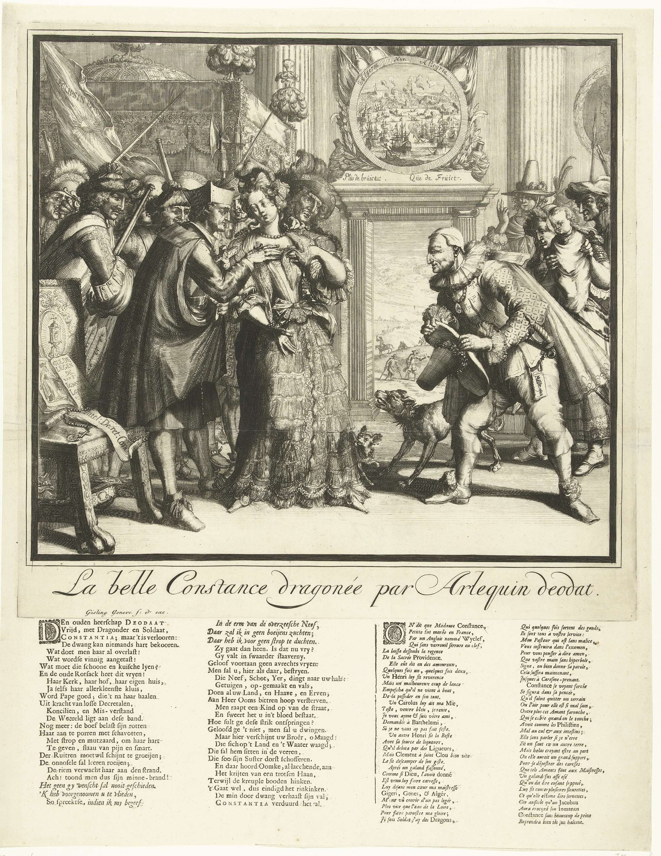 Spotprent op Lodewijk XIV en de vervolging van de protestanten in Frankrijk, 1689. La belle Constance (de Franse protestanten) worden het hof gemaakt door Lodewijk XIV, jezuïeten en soldaten. Bij de groep rechts met koning Jacobus II en de koningin met het ondergeschoven kind kan zij ook geen veiligheid kunnen vinden. Onder de voorstelling 2 ...