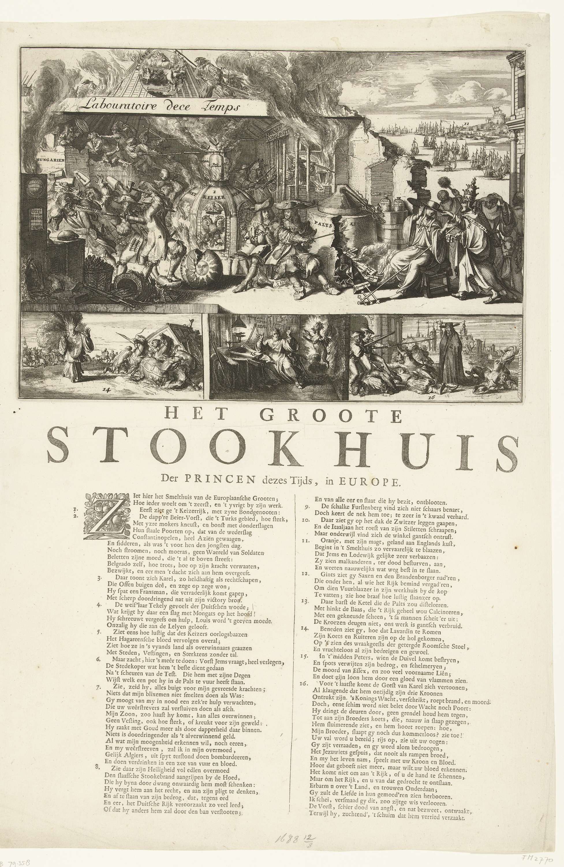 Spotprent op Jacobus II en Lodewijk XIV als alchemisten, 1688. Alchemistenwerkplaats met een grote ketel waarin het vuur onder het keizerrijk. Rechts probeert de paus de bisschop-kardinaal zijn hoed af te nemen. Op de achtergrond de aankomst van de vloot van Willem III. Hieronder 3 kleine scènes met de verongelukte koets van Lavardin (de Franse ...