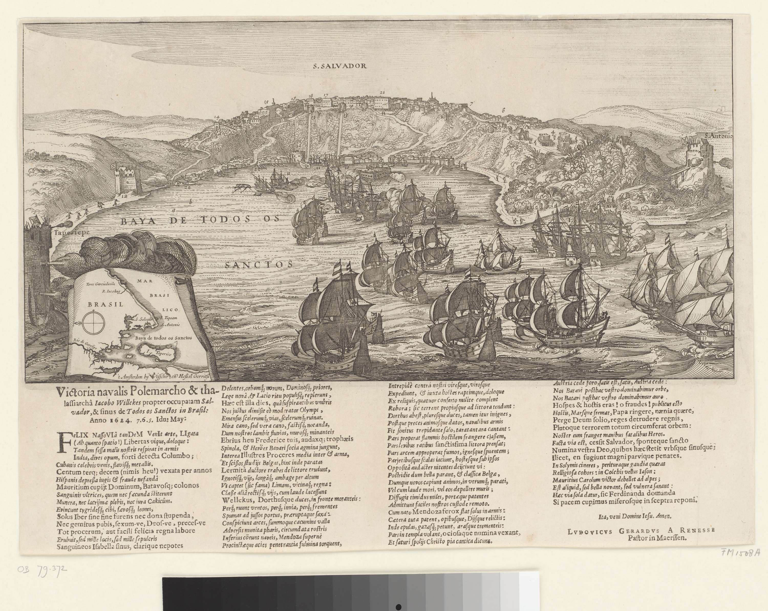 De verovering van San Salvador in Brazilië door admiraal Jacob Willekes voor de WIC, 10 mei 1624. Gezicht op de stad en forten aan de ingang van de baai van waaruit de Hollandse vloot beschoten wordt. Linksonder een inzet met een kaartje van het groter gebied. Onder de plaat gedrukt een tekst in 4 kolommen ...