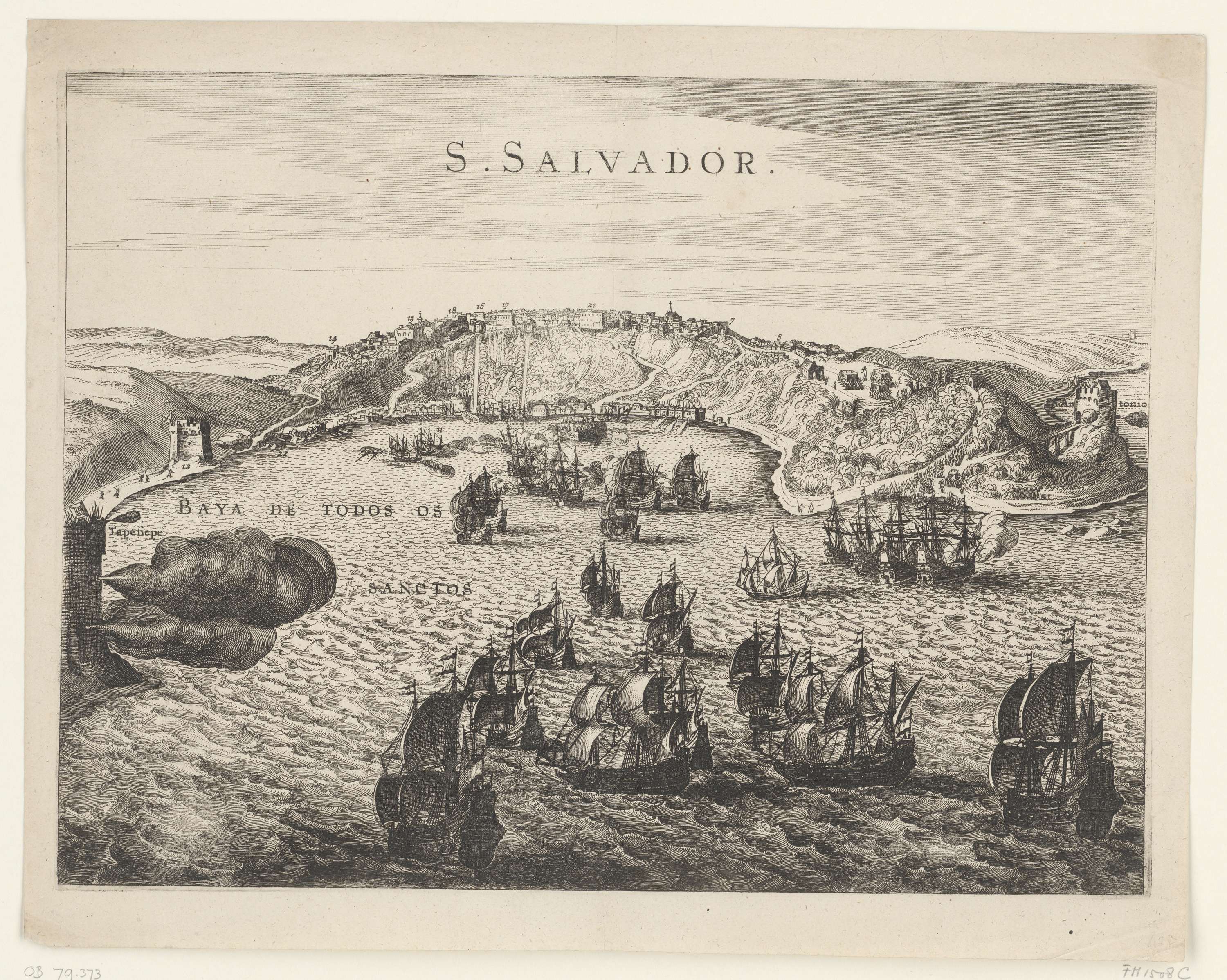 De verovering van San Salvador in Brazilië door admiraal Jacob Willekes voor de WIC, 10 mei 1624. Gezicht op de stad en forten aan de ingang van de baai van waaruit de Hollandse vloot beschoten wordt. Bij de prent behoort een tekstblad.