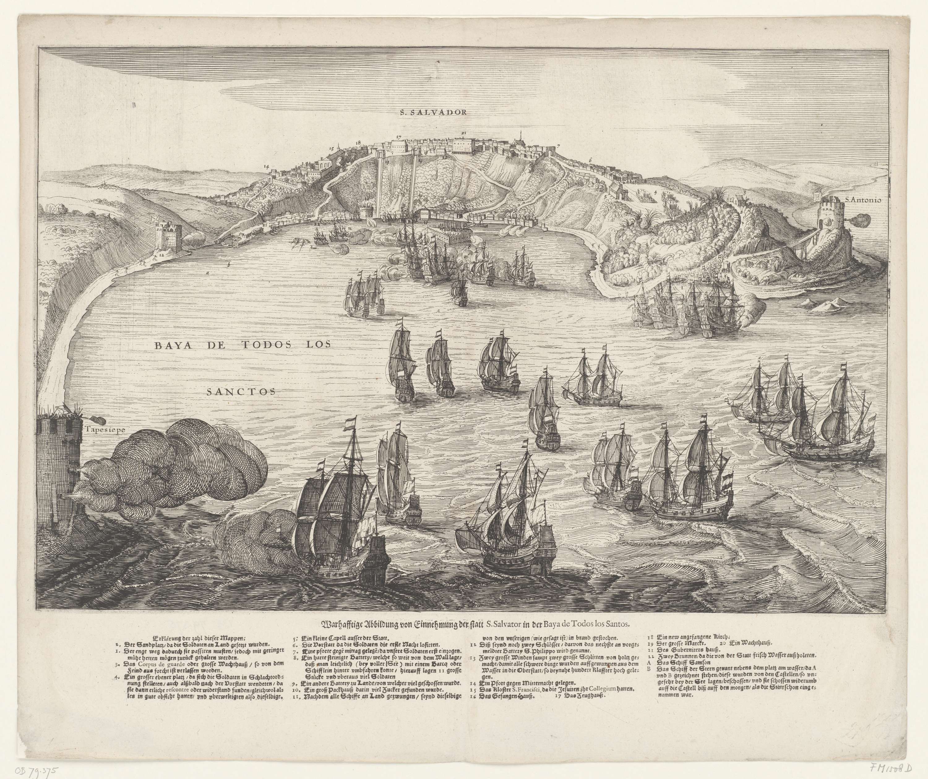 De verovering van San Salvador in Brazilië door admiraal Jacob Willekes voor de WIC, 10 mei 1624. Gezicht op de stad en forten aan de ingang van de baai van waaruit de Hollandse vloot beschoten wordt. Gedrukt onder de plaat de legenda 1-22 en A-B in 4 kolommen in het Duits.