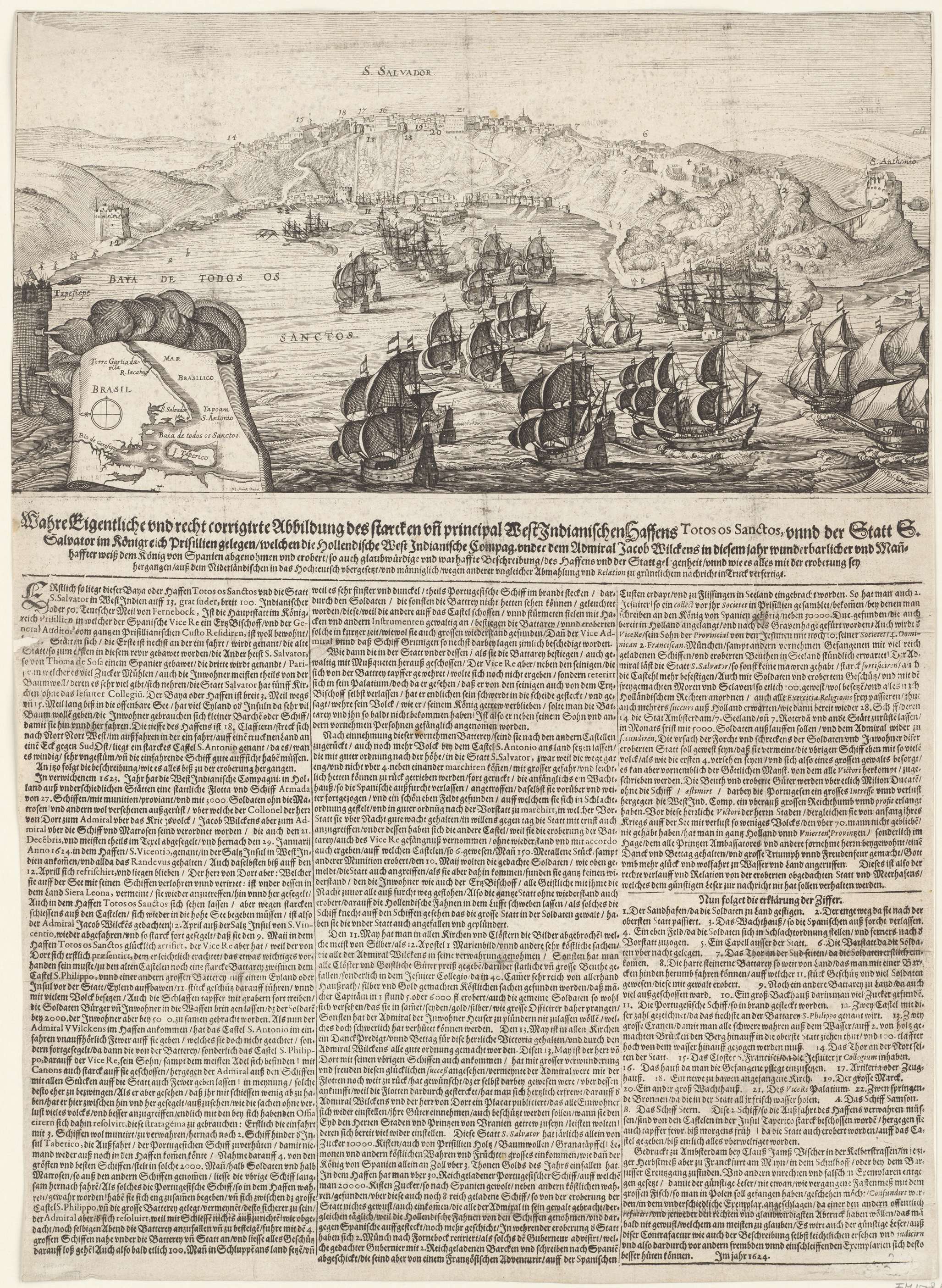 De verovering van San Salvador in Brazilië door admiraal Jacob Willekes voor de WIC, 10 mei 1624. Gezicht op de stad en forten aan de ingang van de baai van waaruit de Hollandse vloot beschoten wordt. Bij de prent behoort een tekstblad. Links een inzet met een kaartje van het groter gebied. Onder de plaat ...