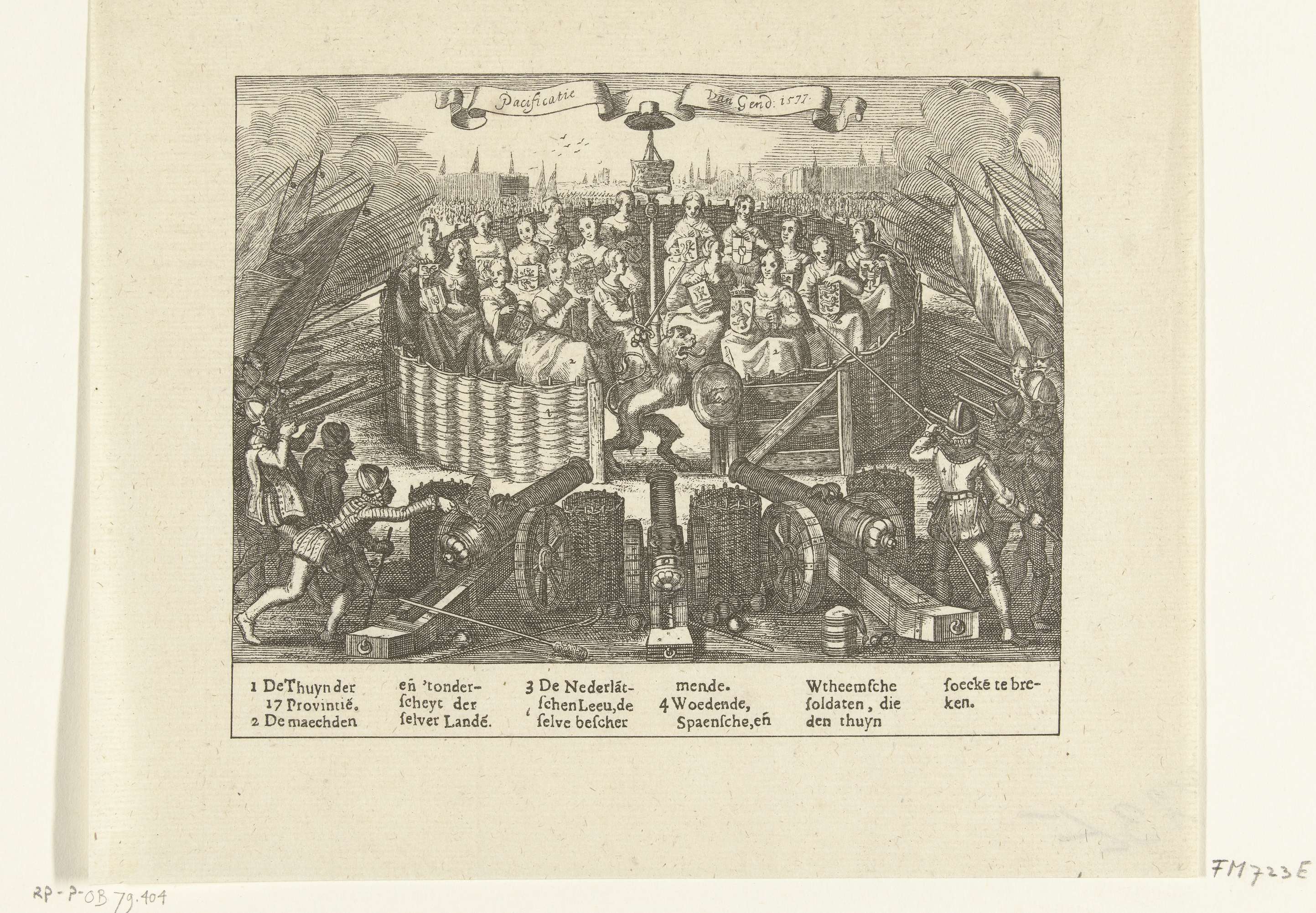 Reproductie van de allegorie op de Pacificatie van Gent, 1576. De Nederlandse Leeuw bewaakt de toegangshek naar de Hollandse Tuin waarin de personificaties van de zeventien provincies zitten. Spaanse soldaten met geweren en kanonnen hebben de tuin omsingeld. Onderaan de legenda 1-4.