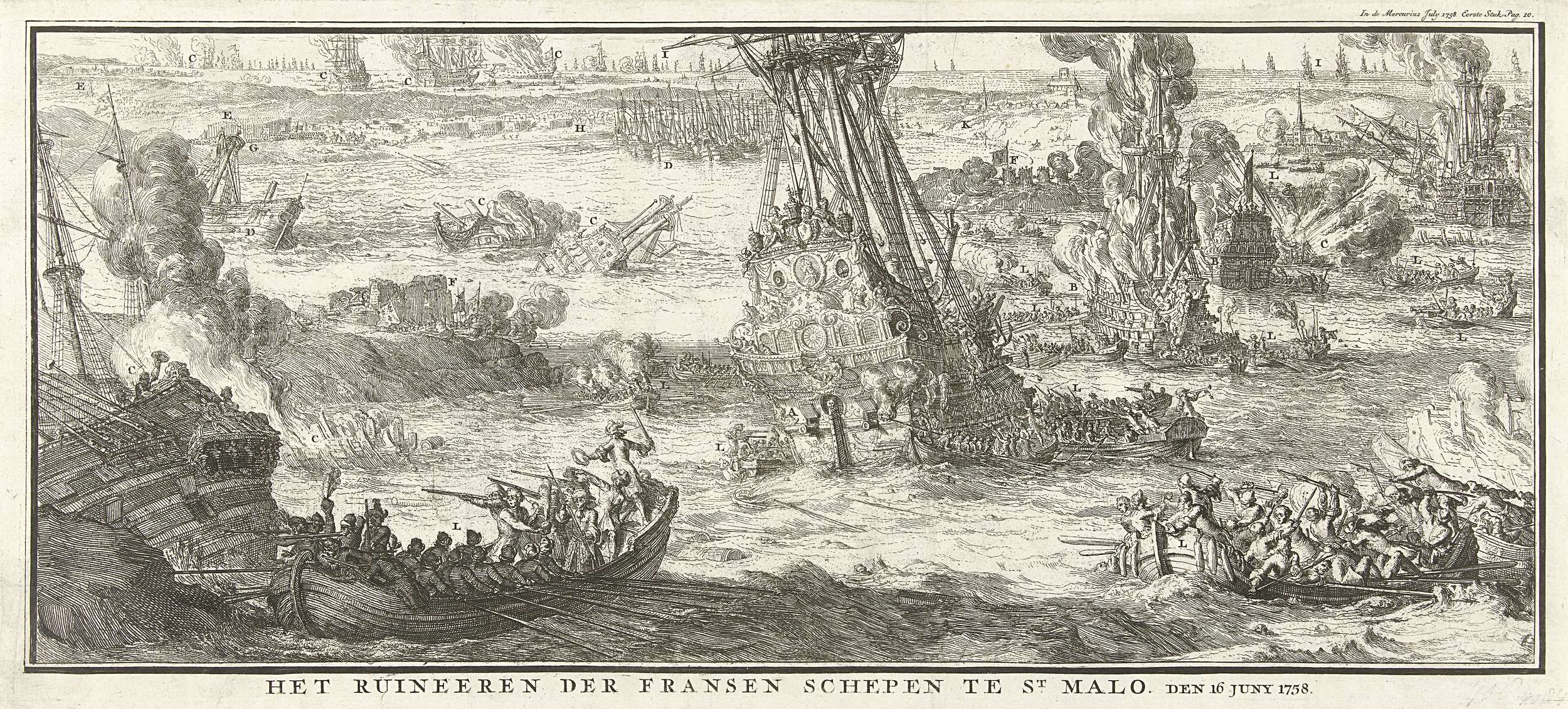 Vernietiging van de Franse schepen te Saint-Malo, 1758. Brandende en zinkende schepen in de haven van Saint-Malo, vernietigd op 16 juni 1758, tijdens de Zevenjarige Oorlog. Elementen in de voorstelling aangeduid met letters. Fragment van een oudere plaat.