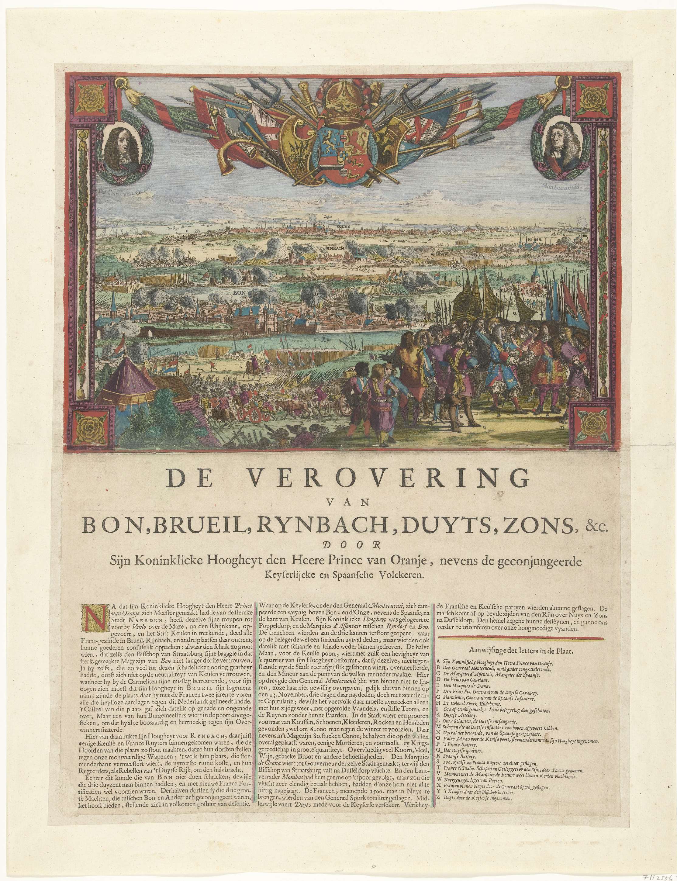Verovering van Bonn, Rheinbach, Brühl en andere Duitse steden door de prins van Oranje, 1673. Gezicht op de aan de Rijn gelegen Duitse steden in vogelvluchtperspectief. Op de voorgrond rechts feliciteren de prins Willem III en graaf Montecuccoli elkaar. Bovenaan een wapentrofee rond het wapen van de prins, links een portret van de prins, rechts ...