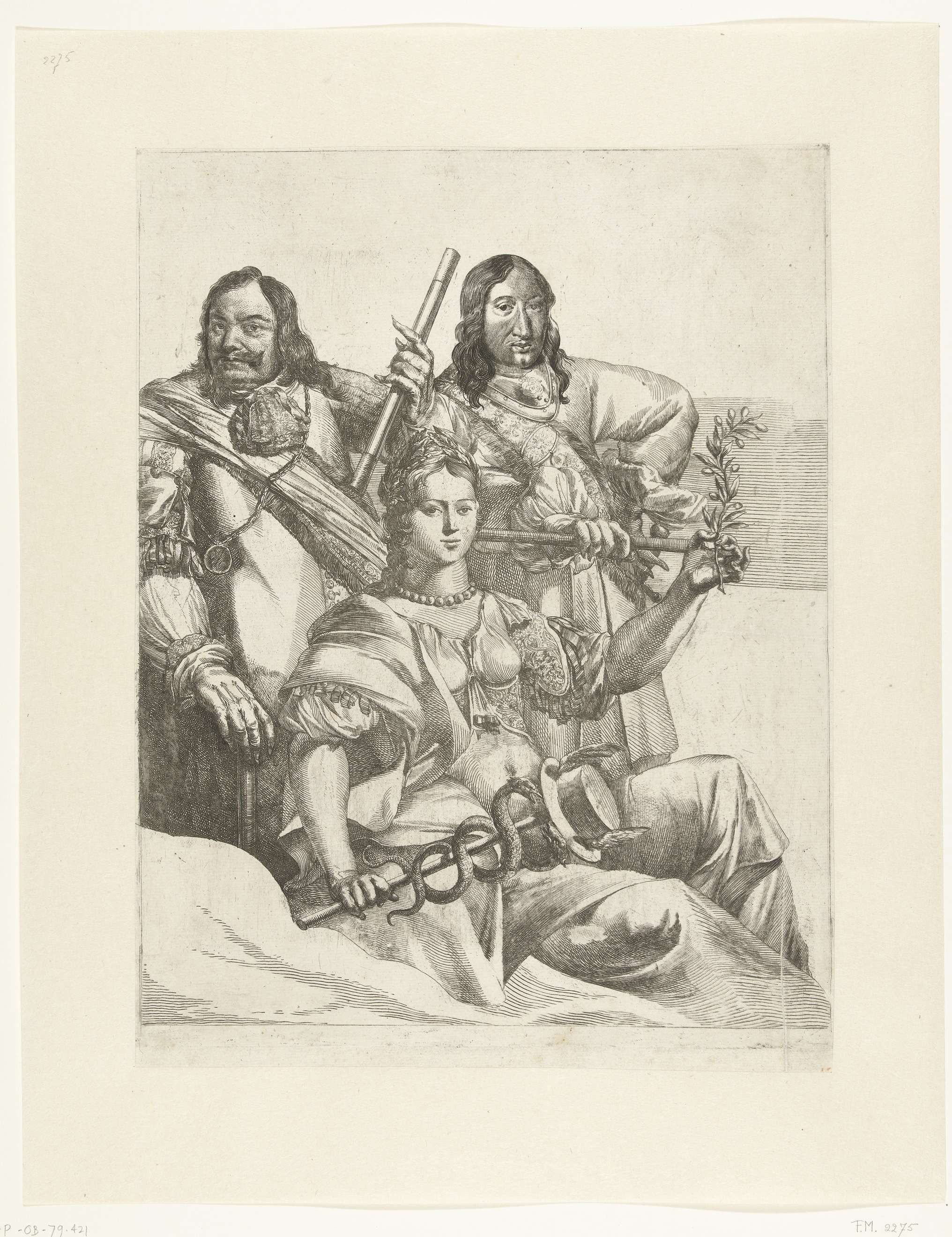 Allegorisch portret van de admiraals Michiel Adriaenszoon de Ruyter en Willem Joseph Baron van Ghent, ca. 1667. Op de voorgrond de zittende personificatie van de Vrede, in de handen de mercuriusstaf en een olijftak.